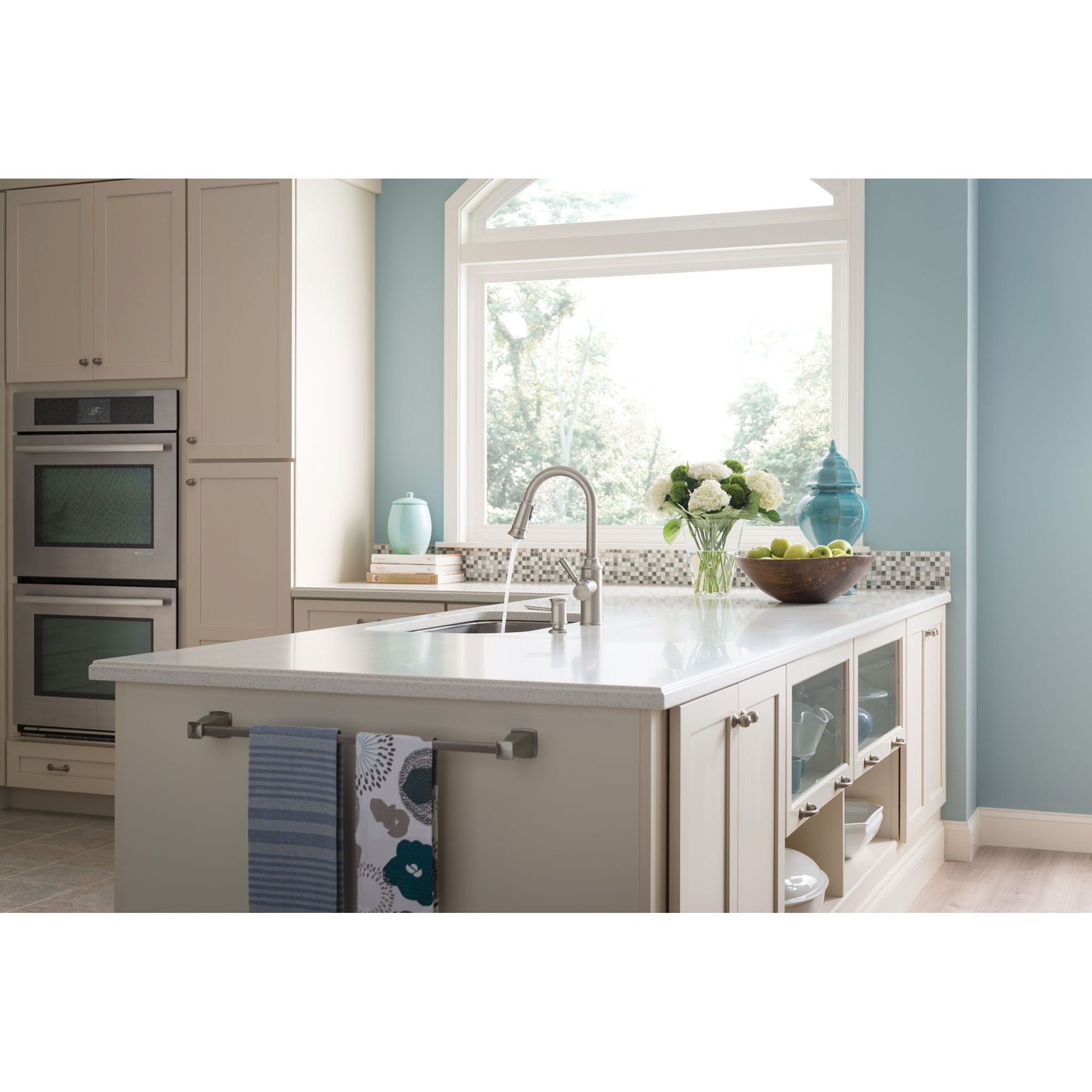 Creative Specialties YB5407BN is a Moen Kingsley brushed nickel drawer pull. This pull is designed to enhance traditional style in your bathroom. It adds a sophisticated touch to cabinets and drawers, helping to create a cohesive look.