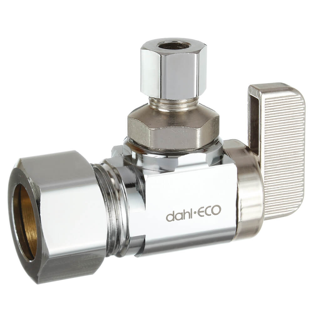 The Dahl 611-33-30 1/2 Nom Comp 5/8 OD x 1/4 OD Comp Angle Supply Stop is made from lead-free chrome-plated brass. This valve is designed for plumbers and other trade professionals needing reliable water flow control.