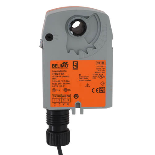 The Belimo TFB24-SR is a direct coupled actuator designed for proportional modulation in HVAC systems. It operates with a control signal of 2 to 10 VDC or 4 to 20 mA. This actuator delivers 22 in-lb of torque and ensures a spring return for reliable fail-safe operation.