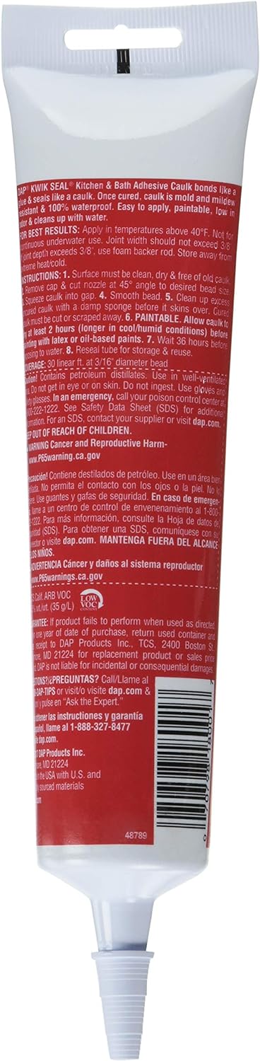 The DAP 18001 Kwik Seal Kitchen and Bath Adhesive Caulk, White, 5.5 Ounce (Pack of 12) is designed for kitchen and bathroom applications. This caulk bonds like glue and seals like caulk, providing a durable and watertight seal.
