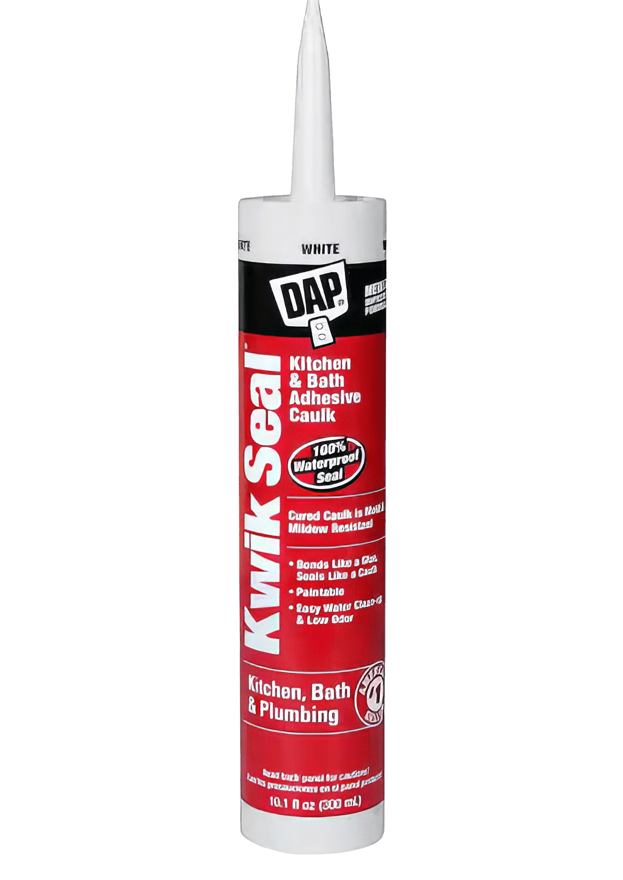 The DAP Kwik Seal 10.1 oz Kitchen and Bath Adhesive Caulk, MPN 18002, is designed for sealing gaps in kitchen and bath areas. This adhesive caulk comes in a cartridge format, making it easy to apply. It provides strong adhesion for a variety of surfaces.