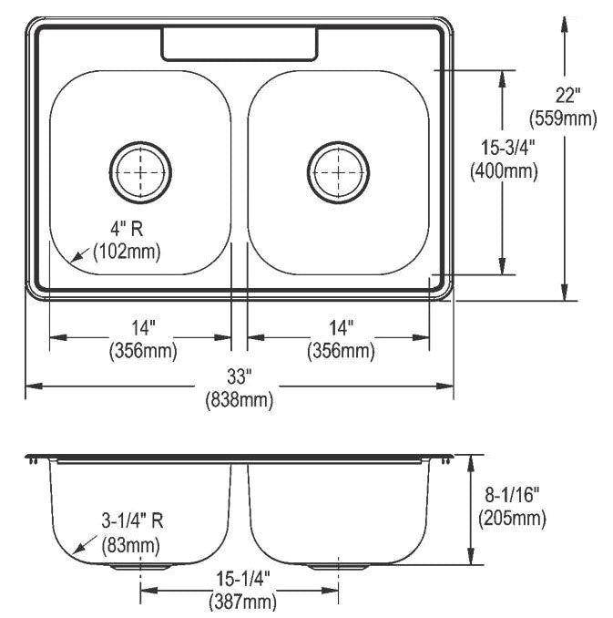 The Dayton DSE233223 is a double bowl drop-in sink made from durable stainless steel. It measures thirty-three inches in length, twenty-two inches in width, and eight and one-sixteenth inches in height. The sink features a sleek elite satin finish that adds a modern touch to any kitchen.