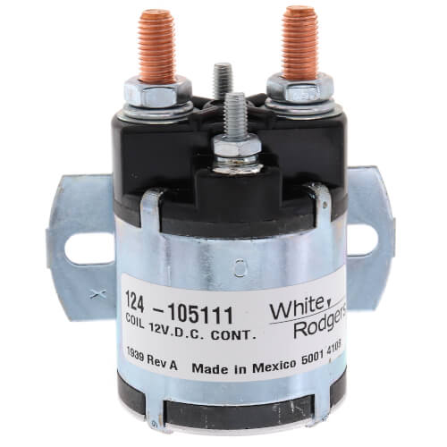 The White-Rodgers DC Power Solenoid 124-105111 is an essential component for industrial applications, providing reliable control for power systems. This product is engineered for continuous duty operation, ensuring uninterrupted performance. The solenoid features a single-pole, normally open configuration with a 12v DC coil voltage and a 100 Amp continuous current rating.