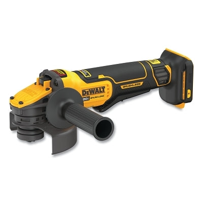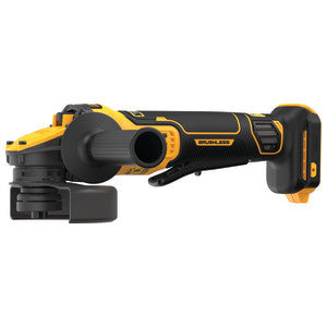 The DeWalt DCG416B is a powerful angle grinder designed for efficient grinding and cutting. This tool features a brushless motor that delivers one thousand five hundred fifty max watts out and can reach speeds of up to nine thousand revolutions per minute. The DCG416B utilizes FLEXVOLT ADVANTAGE technology for improved performance, especially when paired with the DCB606 FLEXVOLT battery, providing up to fifty-four percent more power compared to the standard DCB205 battery.