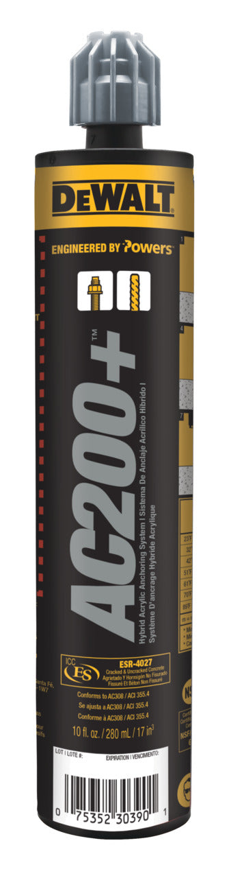 The Dewalt PFC1271050 is a two-component, high strength adhesive anchoring system. This system includes injection adhesive in plastic cartridges, mixing nozzles, dispensing tools, and hole cleaning equipment. It is designed for bonding threaded rod and reinforcing bar hardware into drilled holes in concrete and for post-installed reinforcing bar connections.