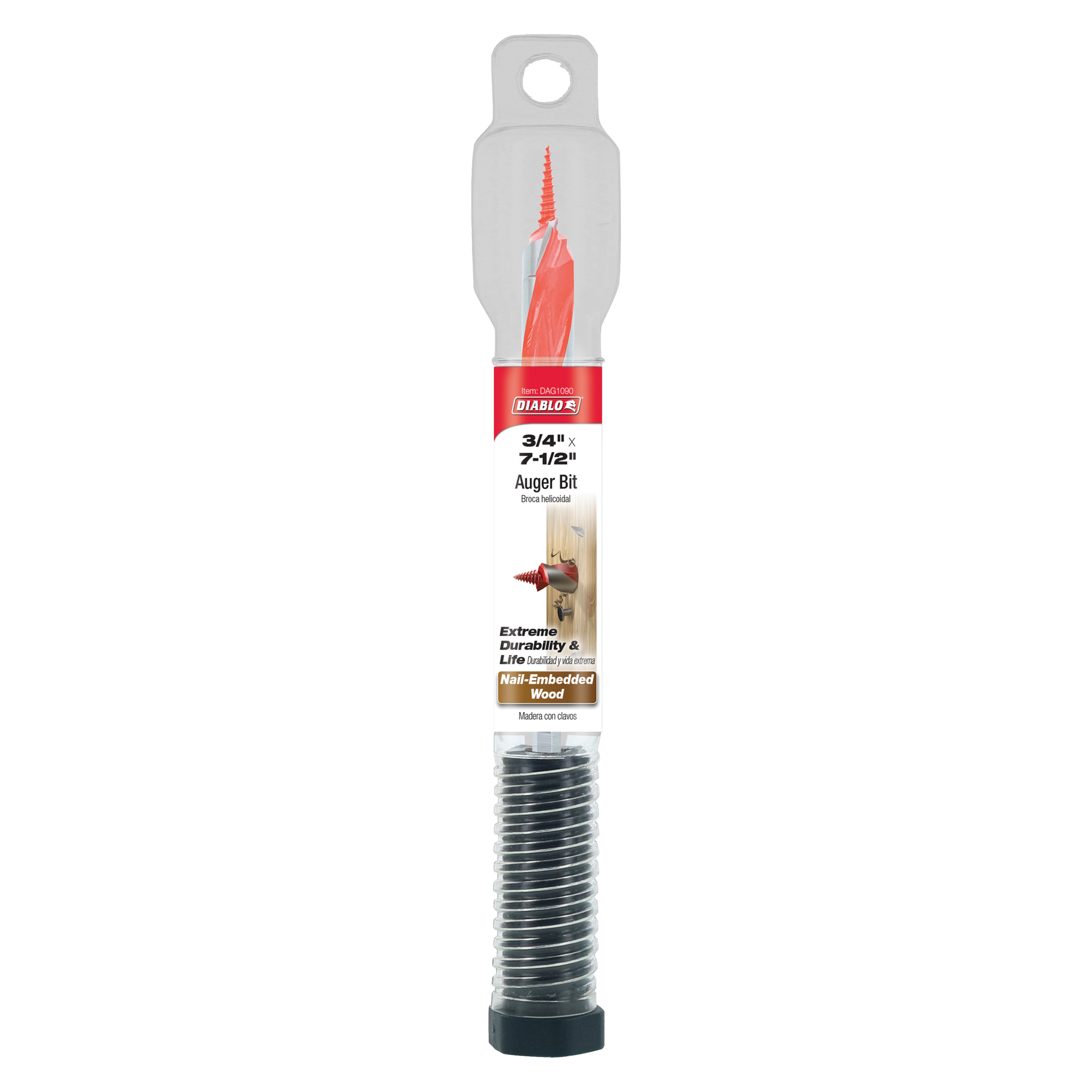The Diablo DAG1090 auger bit is designed for maximum performance in wood drilling tasks, particularly in nail-embedded wood. This bit features a 3/4 inch diameter and a 7-1/2 inch length, making it suitable for various applications. It includes the Dura-Tip, which enhances durability and ensures smooth drilling.