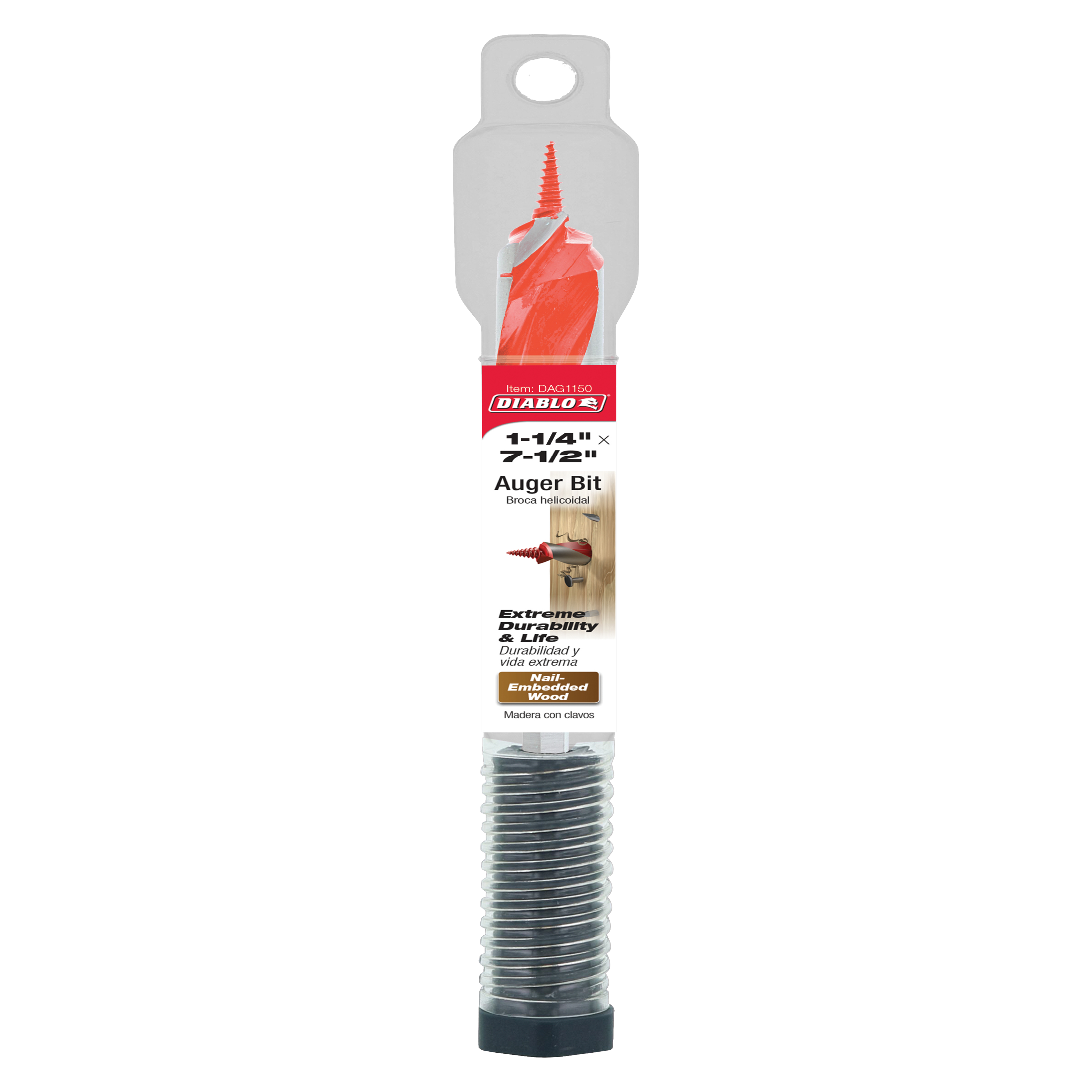 The Diablo DAG1150 1-1/4 x 7-1/2 in Auger Drill Bit is designed for efficient wood drilling, especially in nail-embedded wood. This high-speed steel auger bit features a dual cutting edge for smooth hole drilling and a self-feeding Dura-tip that pulls the bit into the wood effortlessly. The deep flutes ensure quick chip removal, enhancing drilling efficiency and prolonging bit life.