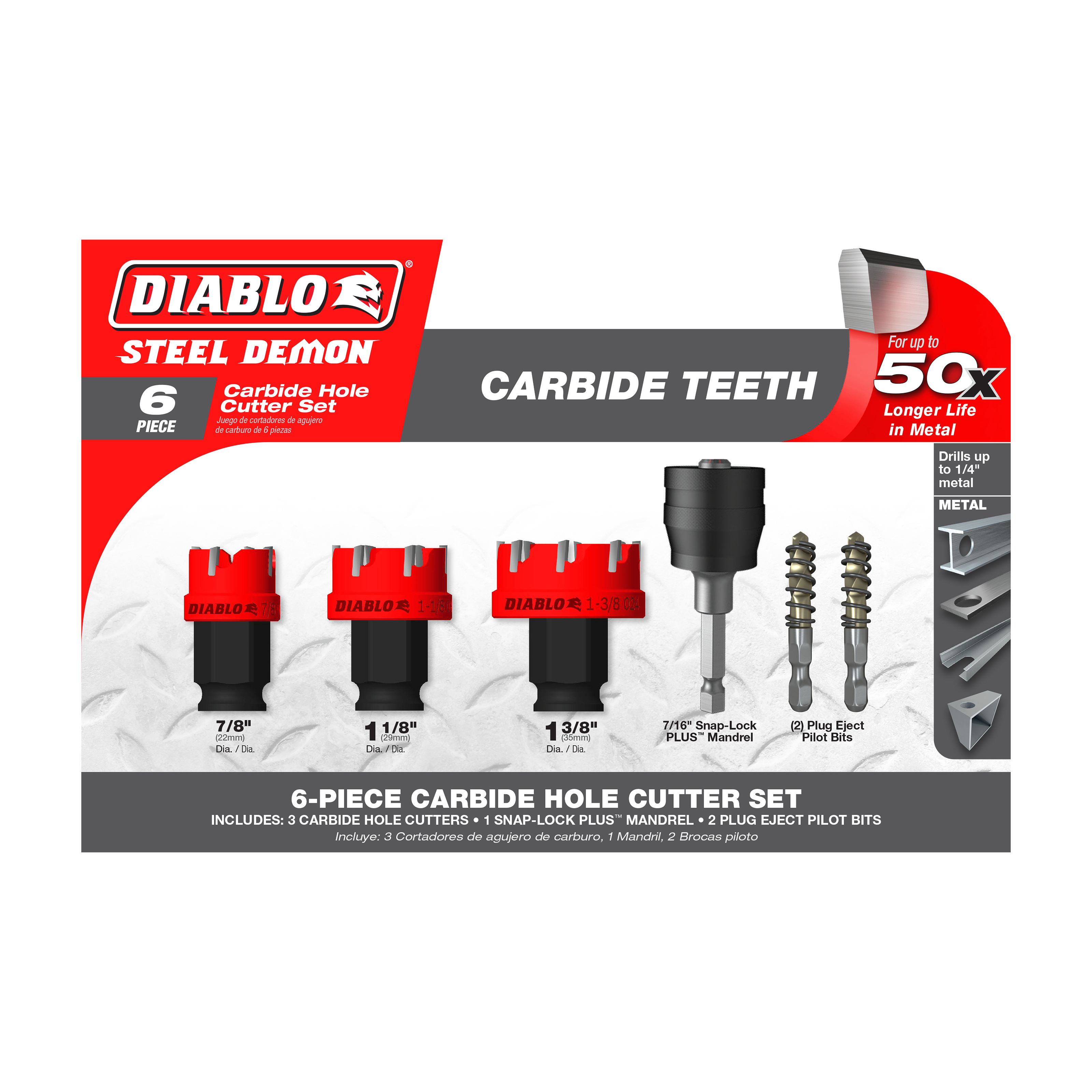The Diablo DHS06CFS 6-Piece Steel Demon Carbide Teeth Hole Cutter Set with Snap-Lock Plus Mandrel System provides unparalleled performance in metal drilling applications. This set includes six cutters made from durable carbide that can efficiently create clean, precise holes in metals.