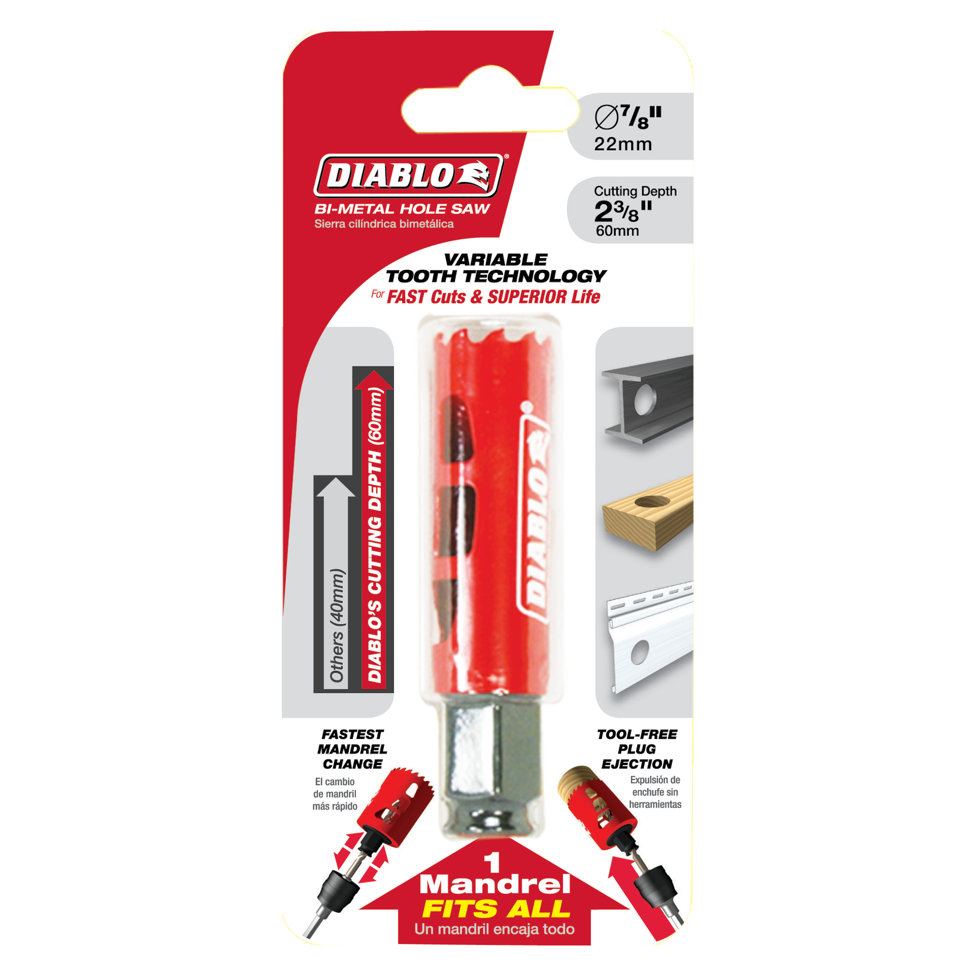 The Diablo DHS0875 7/8 Hole Saw with Snap-Lock Plus Mandrel System delivers superior performance and efficiency. This innovative hole saw system simplifies the attachment process, making it easy to change hole saws without downtime. The carbide-tipped design allows for cutting through various materials, ensuring versatility and durability.