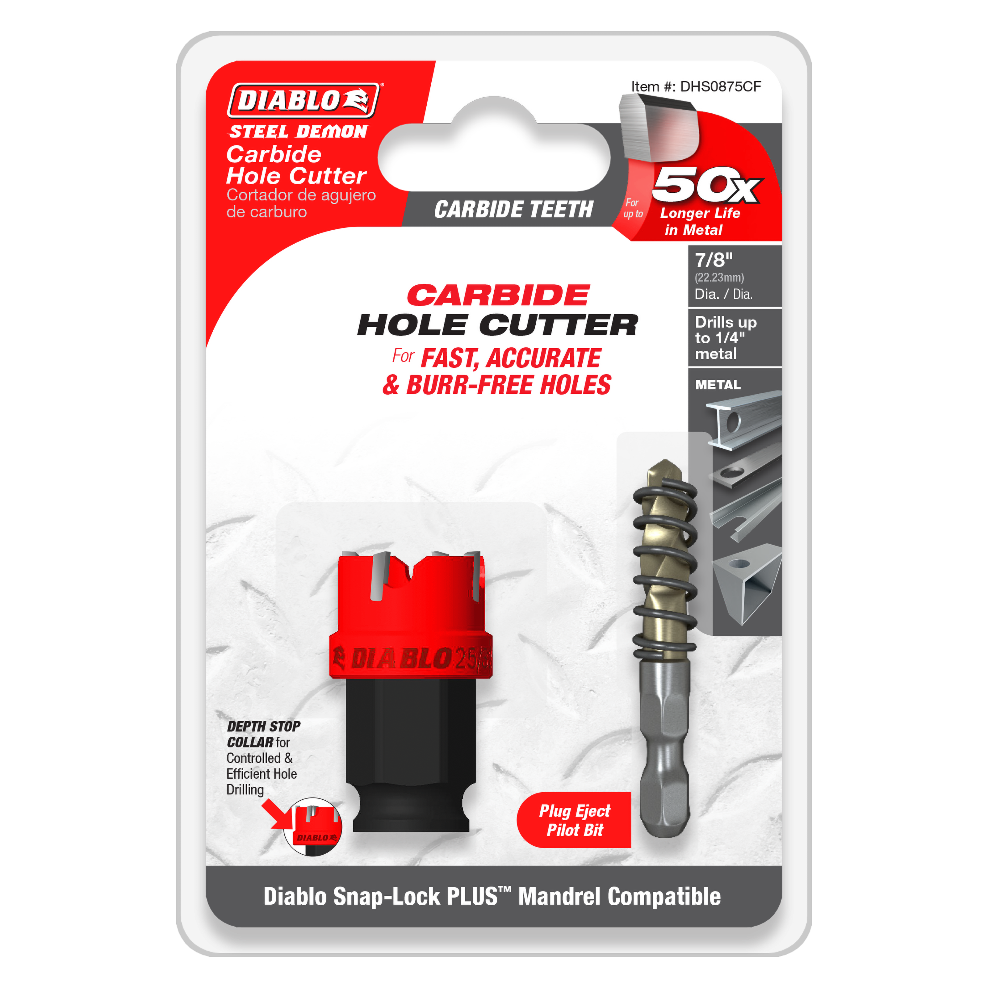 The Diablo DHS0875CF Steel Demon 7/8 inch carbide teeth hole cutter with Snap-Lock Plus mandrel system is designed for trade professionals needing efficient and high-performance hole cutting in metal. Featuring Diablo's high-performance carbide teeth, this cutter achieves up to 50 times longer cutting life and delivers a faster cutting performance.