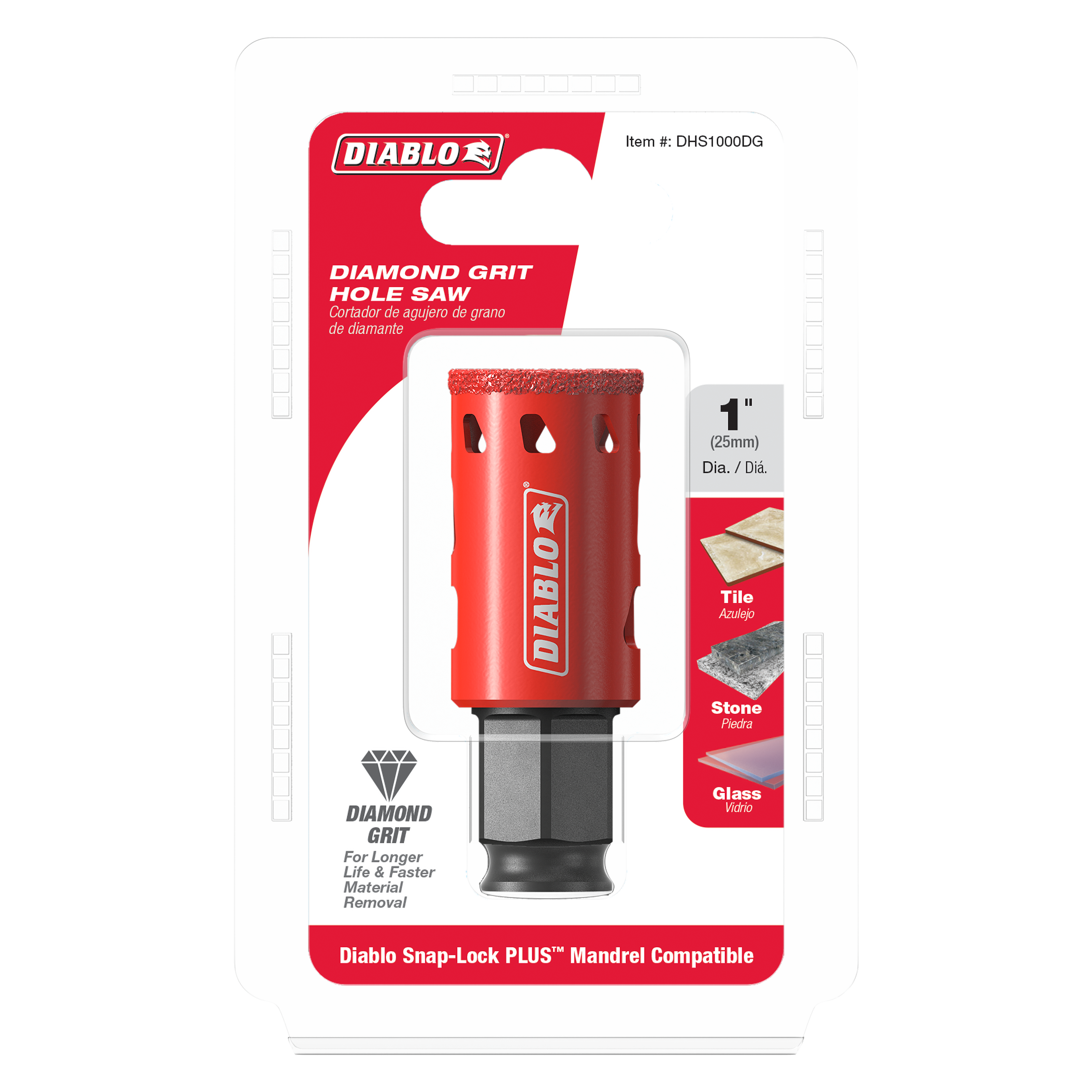 The Diablo DHS1000DG Diamond Grit Hole Saw is a high-performance tool designed for durable and efficient drilling. It features a diamond grit edge for prolonged life and faster material removal. Compatible with the SnapLock Plus mandrel system, it offers quick and easy cup changes.