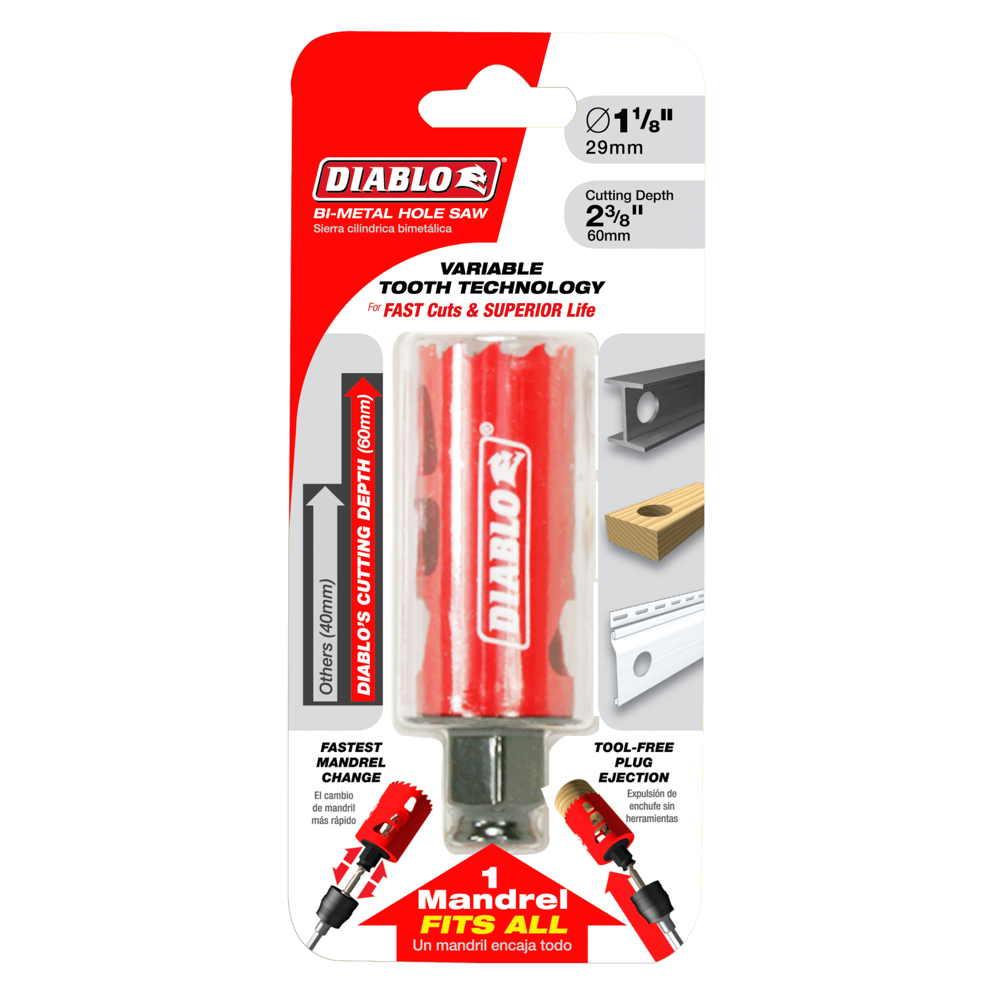 Fits with Snap-Lock Plus mandrel system allowing a quick and easy change. Mandrel fits all Diablo hole saws from 5/8 to 6 inches in diameter. Tool-free plug ejection for fast material removal.
