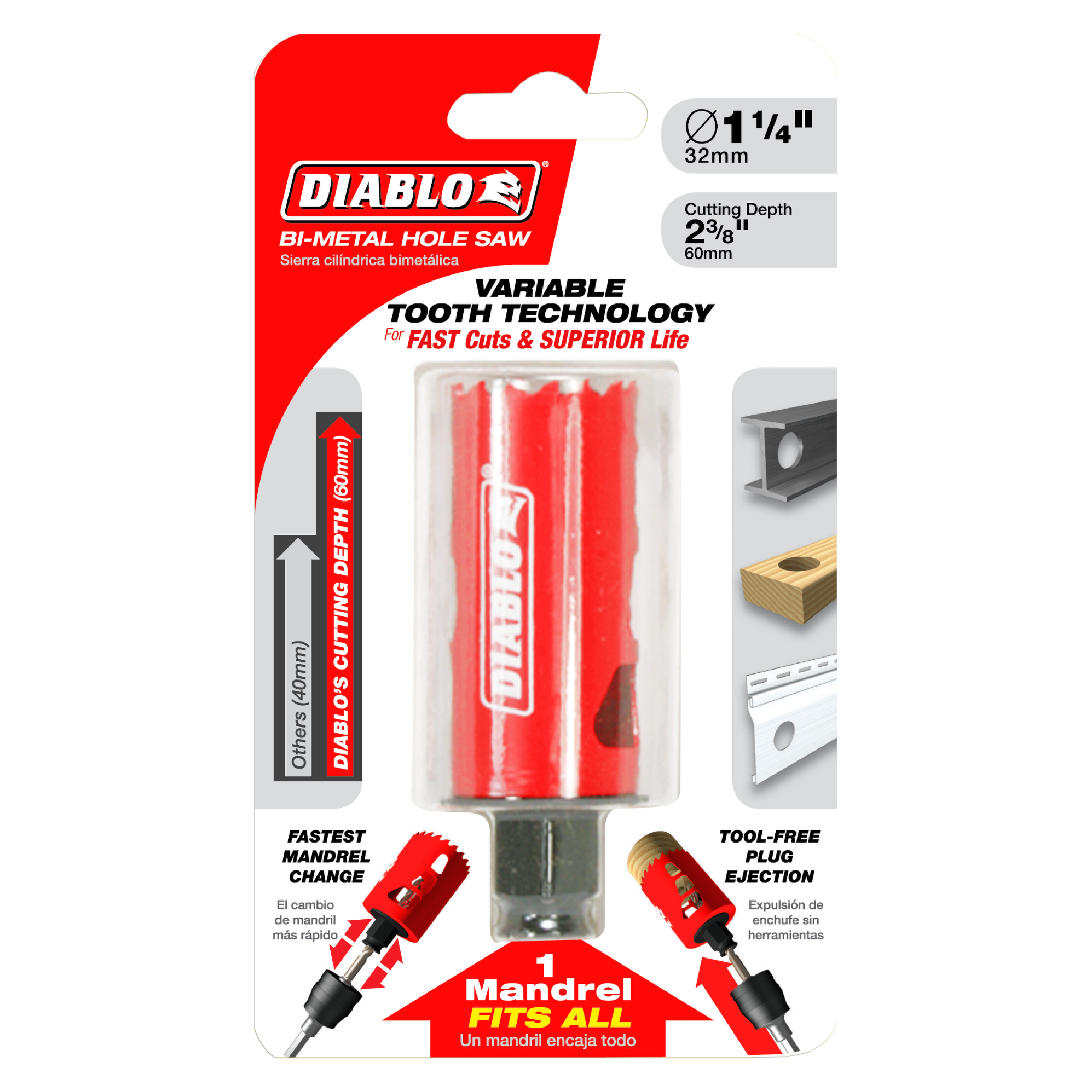 The Diablo DHS1250 1-1/4 in. Hole Saw with Snap-Lock Plus Mandrel System is designed for trade professionals. This product, bearing the MPN DHS1250, is perfect for drilling through materials such as wood, plastic, aluminum, metal, and stainless steel.