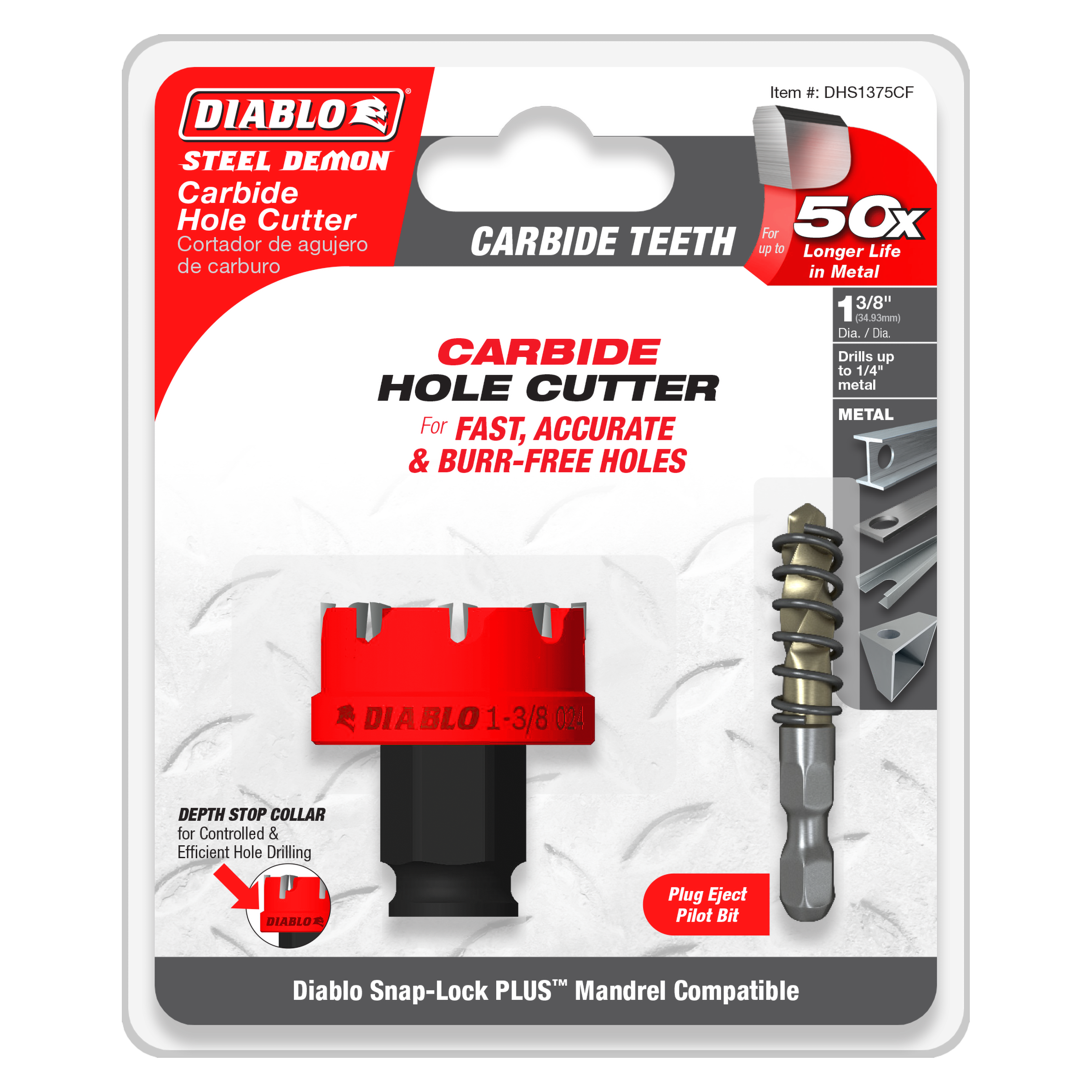 Diablo DHS1375CF Steel Demon 1-3/8 inch carbide teeth hole cutter with a Snap-Lock Plus mandrel system offers a high-performance solution for drilling precise holes in metal. This hole cutter is designed to deliver 50 times longer cutting life and faster performance.