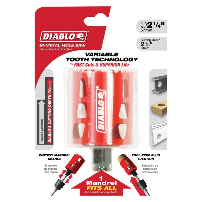 The Diablo DHS2250 hole saw features a bi-metal construction and a Snap-Lock Plus mandrel system designed for easy attachment and fast, efficient cutting, particularly suitable for drilling through wood, plastic, aluminum, metal, and stainless steel. With a 2-1/4 inch hole diameter, it facilitates deeper bores in a single pass due to its 2-3/8 inch cutting depth.