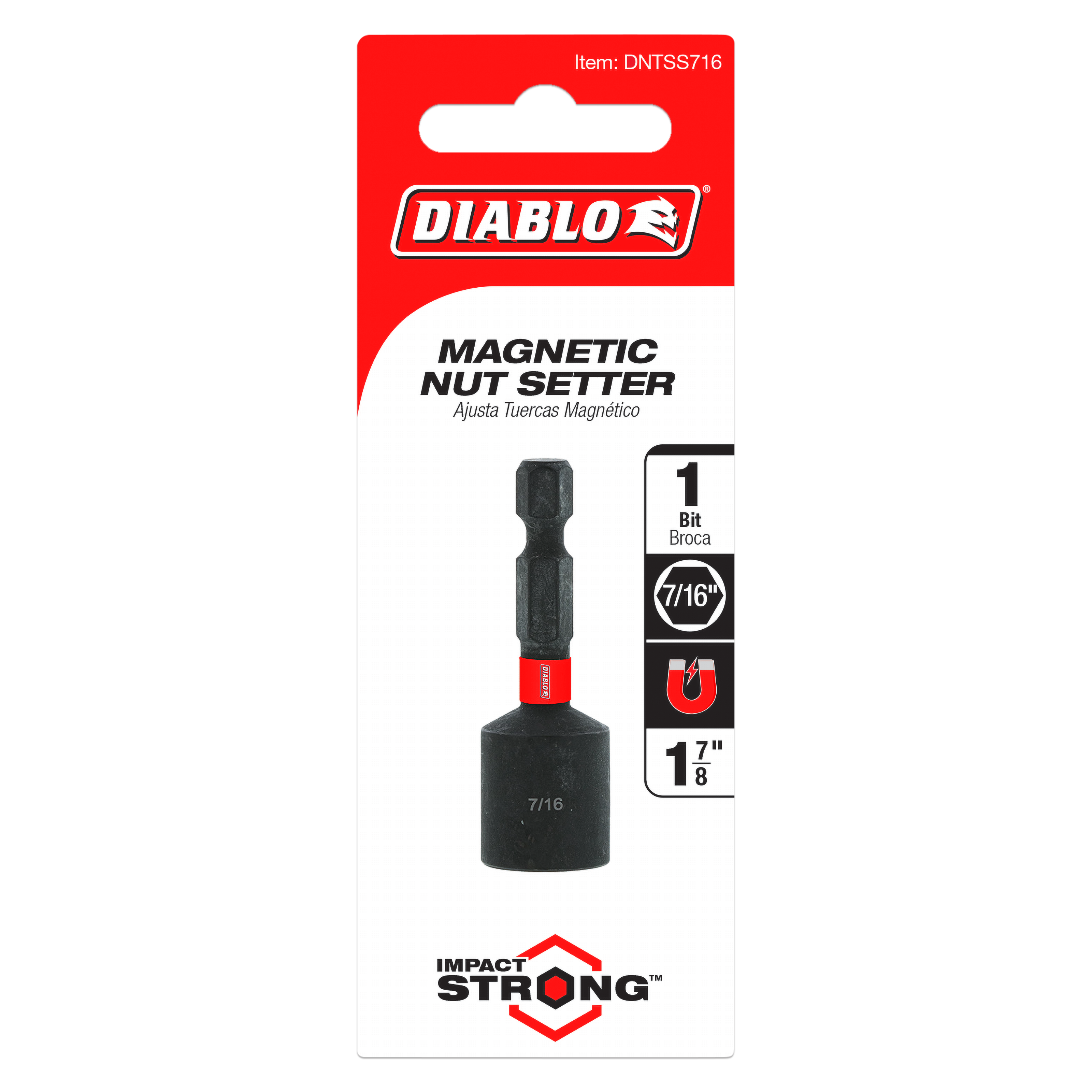 The Diablo DNTSS716 Magnetic Nut Setter offers a robust solution for secure and precise fastening tasks. Engineered with a permanent magnet, this tool provides a firm grip on screws and hex nuts, enhancing productivity and reducing wobble. Its 1-7/8 inch length and 1/4 inch hex shank make it compatible with a wide range of drill and driver models, both corded and cordless.