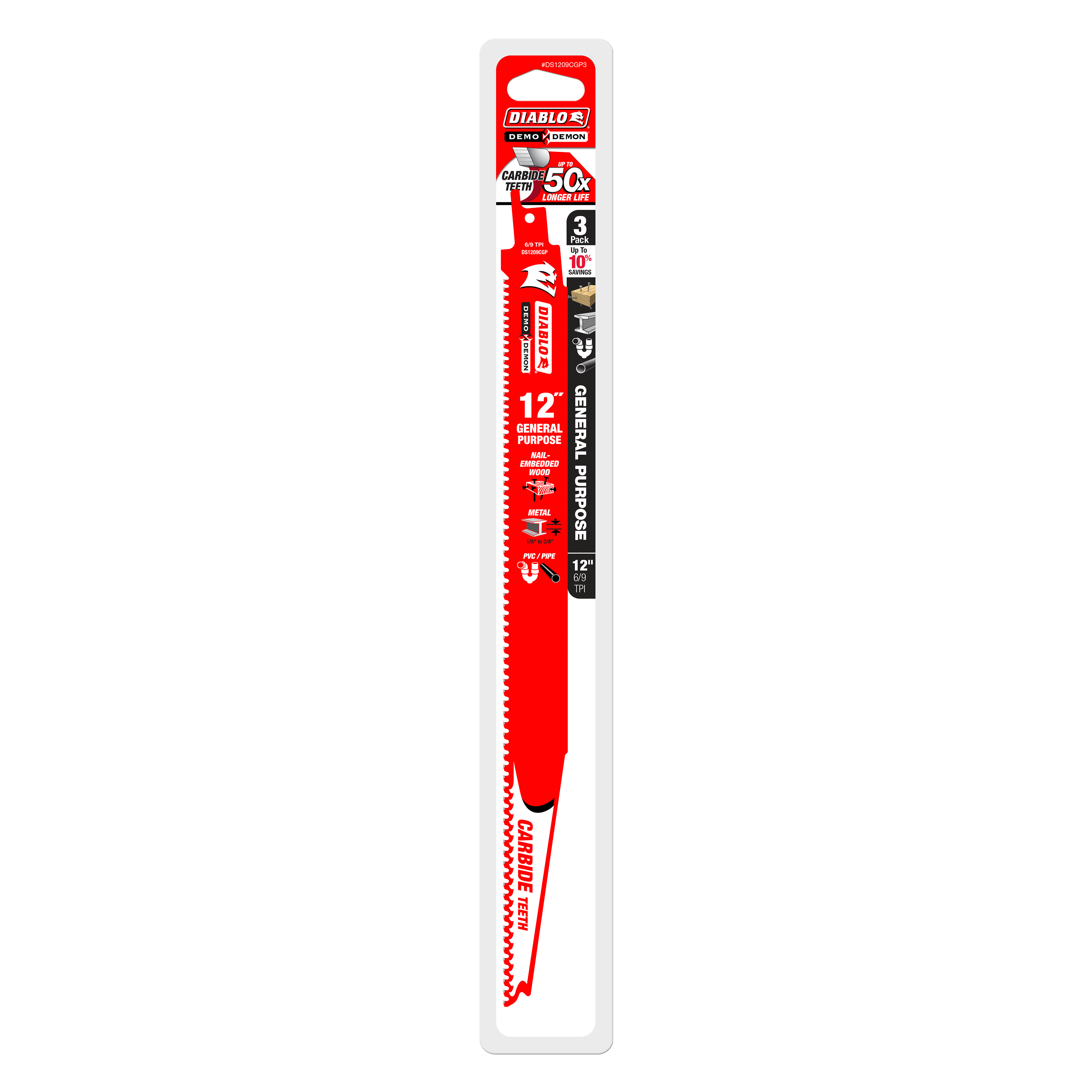 The Diablo DS1209CGP3 is a set of three 12-inch carbide reciprocating saw blades designed for general-purpose cutting in wood and metal. These blades feature nine teeth per inch for efficient cutting and are ideal for demolition applications.