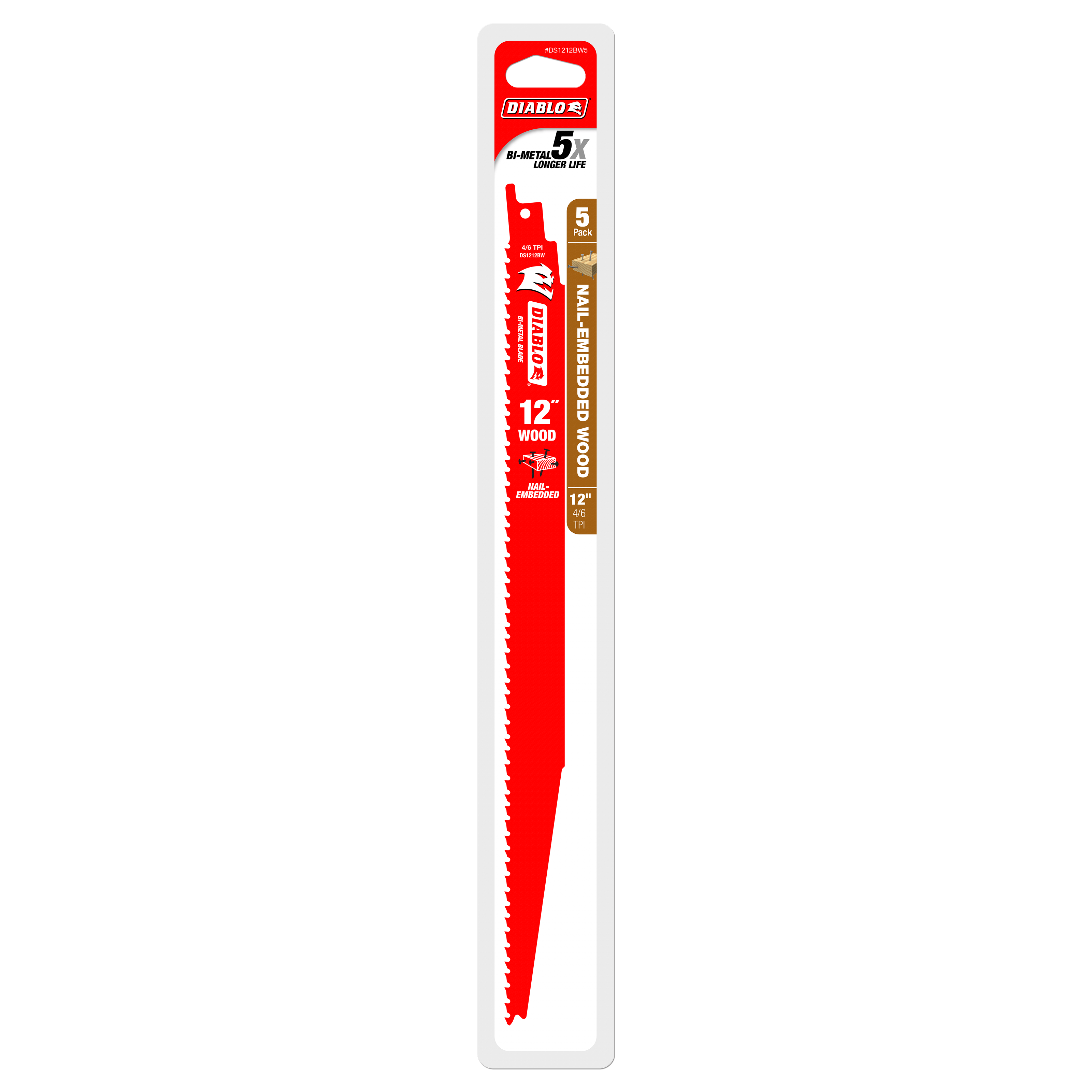 The Diablo DS1212BW5 is a twelve-inch reciprocating saw blade designed for cutting nail-embedded wood. This product comes in a five-pack to support various cutting tasks efficiently.