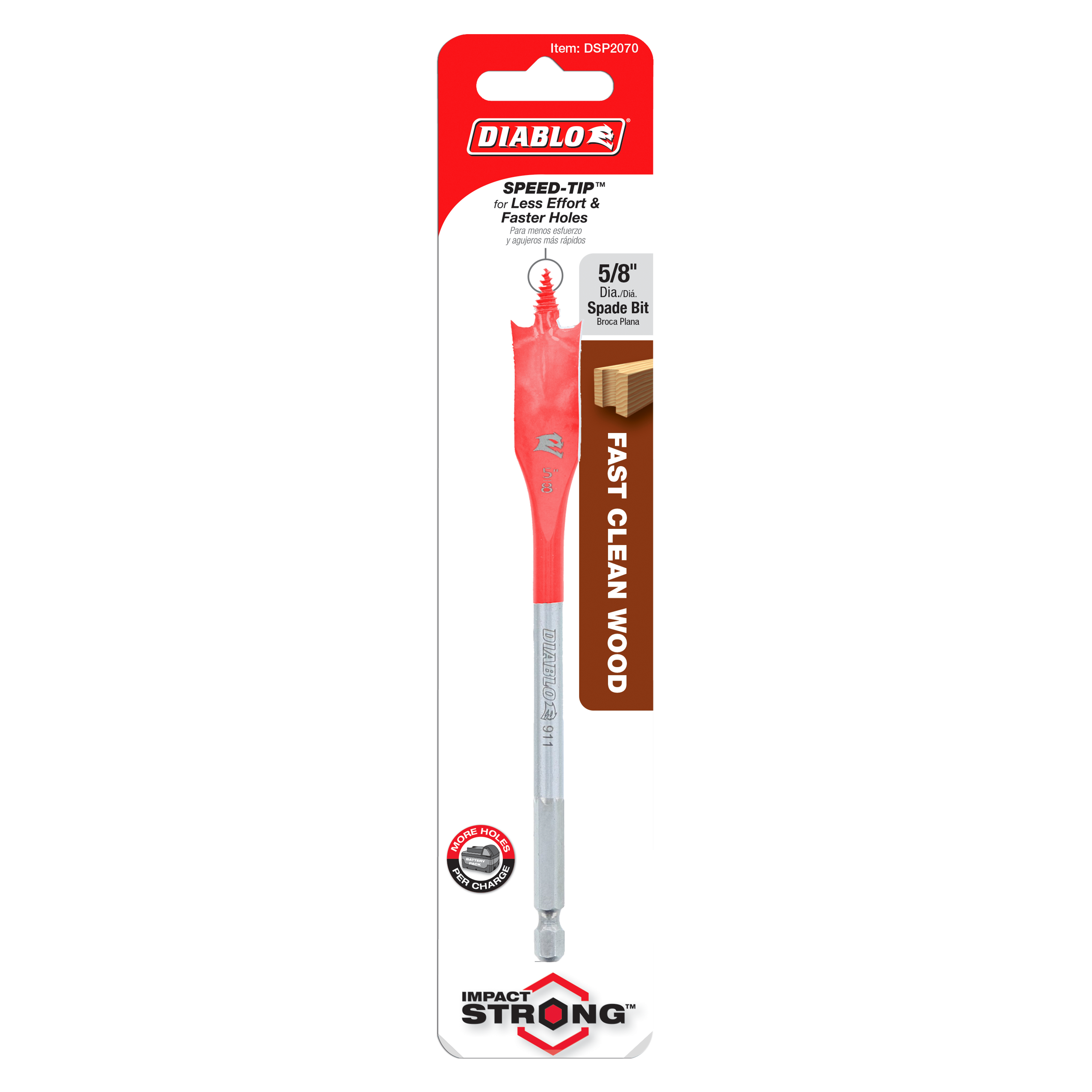 The Diablo DSP2070 is a robust 5/8 inch spade bit designed with a 1/4 inch shank, tailored for high-speed drilling in wood. It's engineered to optimize performance, especially in both cordless and corded impact and drill drivers.