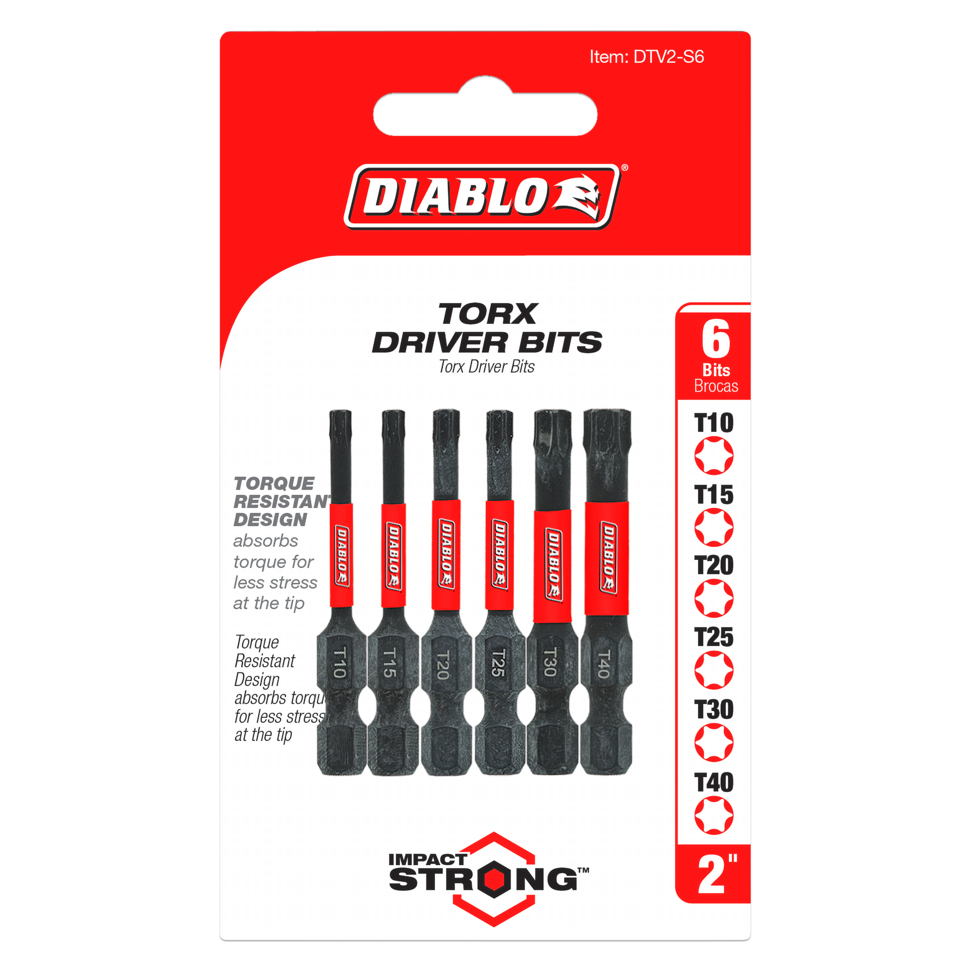 The Diablo DTV2-S6 is a Torx drive bit assorted pack. It includes six different sizes including T10, T15, T20, T25, T30, and T40. This pack is designed for enhanced performance, making it suitable for various fastening tasks.