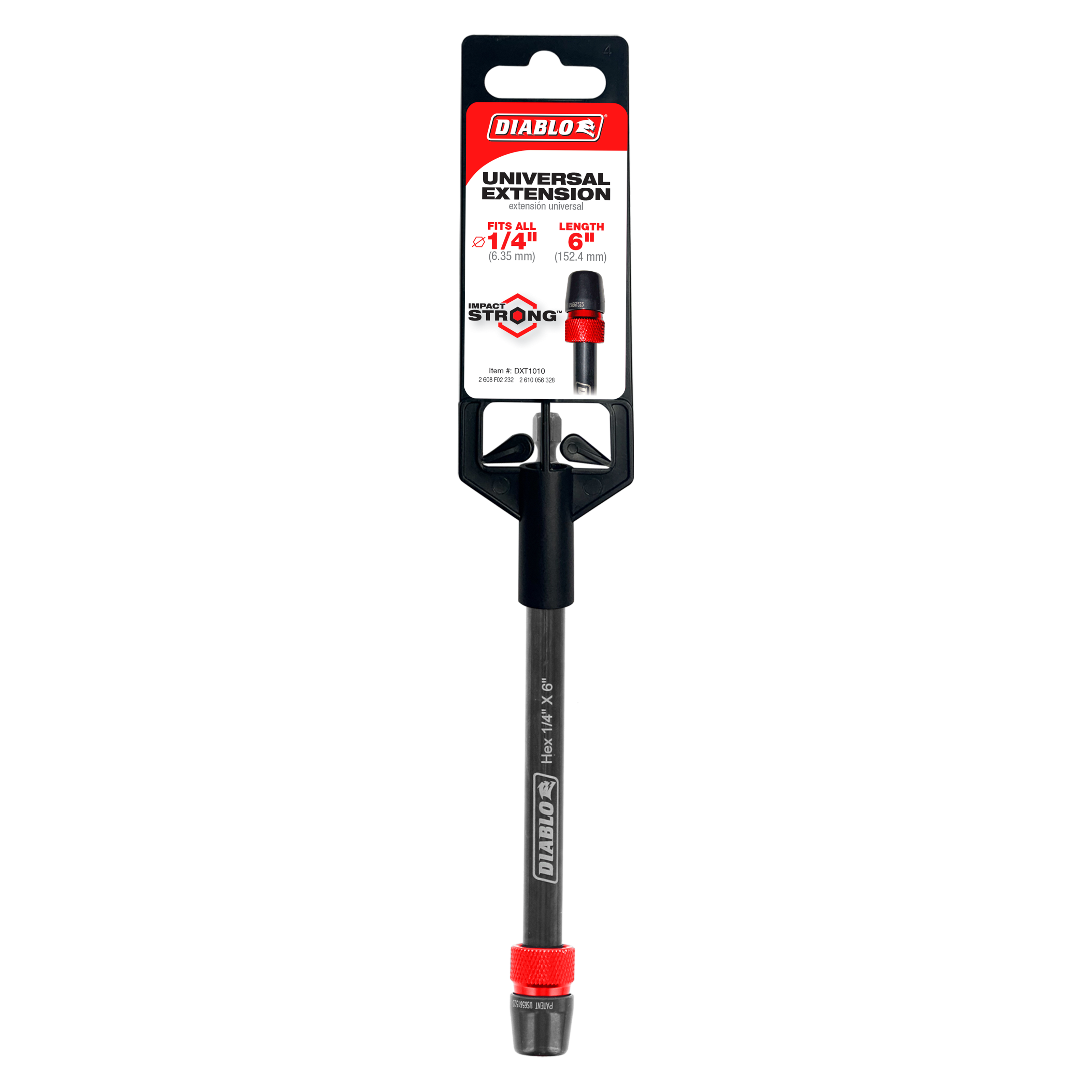 The Diablo DXT1010 features a six-inch quick-change shank extension designed for enhancing the reach and versatility of your power tools. This extension is ideal for accessing hard-to-reach areas and is compatible with both cordless and corded impact and drill drivers.