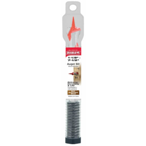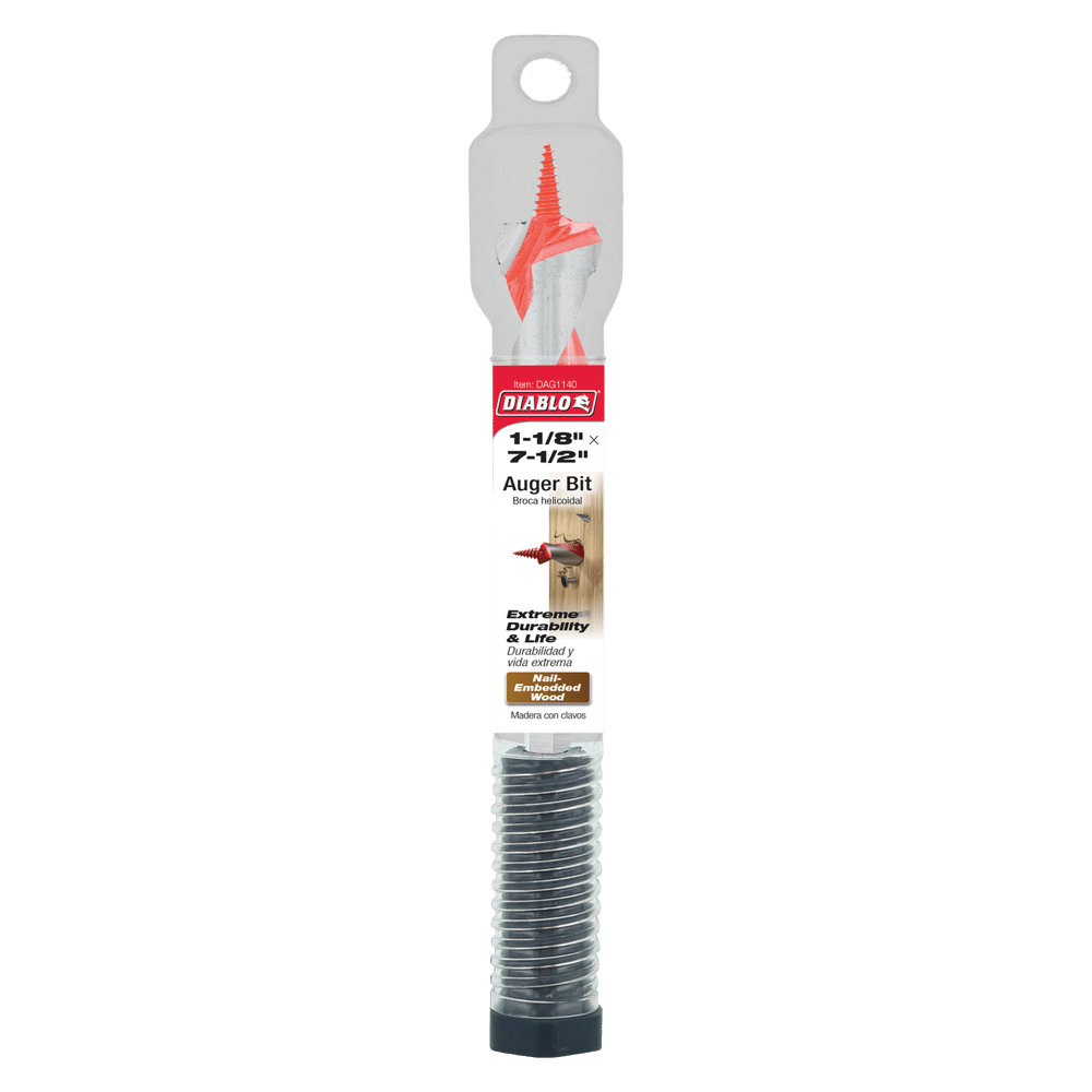 Diablo Tools DAG1140 auger bit has been designed for maximum performance and durability in nail-embedded wood applications. This 1-1/8 inch by 7-1/2 inch drill bit ensures precise and clean holes through its two-step cutting action. The self-feeding Dura-Tip enhances durability, pulling the bit smoothly through wood, even with embedded nails. The bit's deep flutes are engineered for fast chip removal, making it an efficient choice for any wood drilling task.
