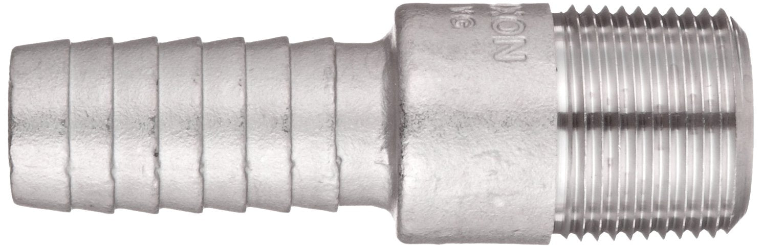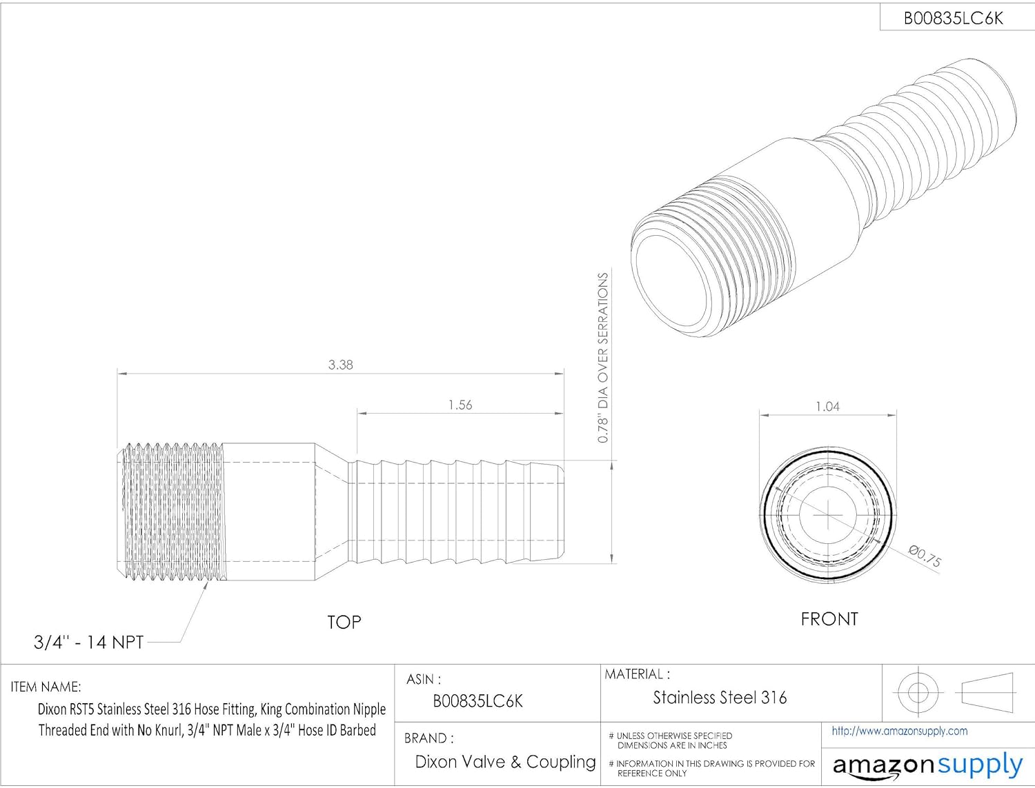 The Dixon RST5 is a stainless steel hose fitting designed for durability and reliable connection. This fitting features a king combination nipple with a threaded end and no knurl. It connects a three-fourths inch NPT male end to a three-fourths inch hose ID barbed end, providing a secure fit for various applications. The fitting is constructed from type 316 stainless steel for superior strength and corrosion resistance, making it suitable for challenging environments.