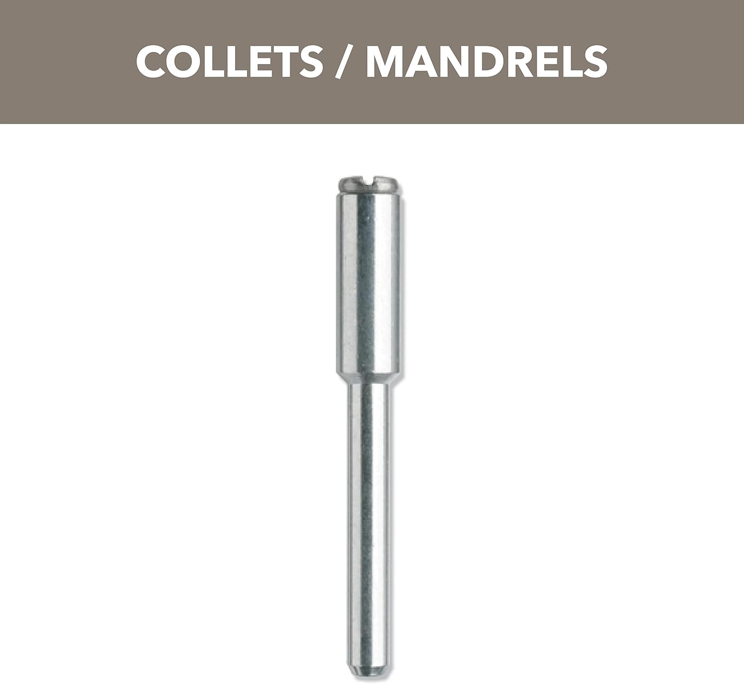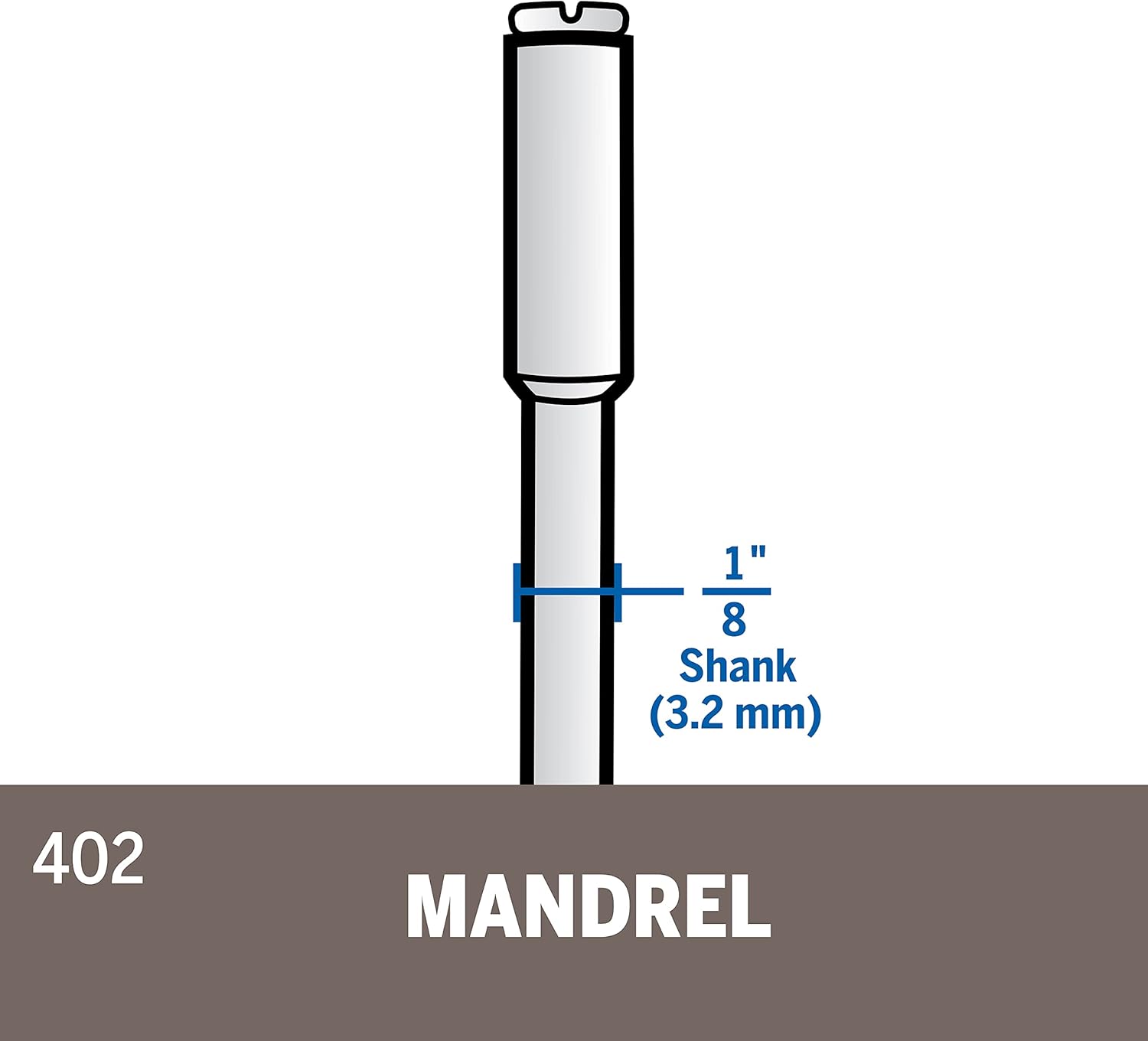 The Dremel 402 Mandrel features a 1/8 inch shank and a slotted screw head, making it simple to swap out accessories. It securely holds various attachments, such as cutting wheels and sanding discs, ensuring precision and stability during use.
