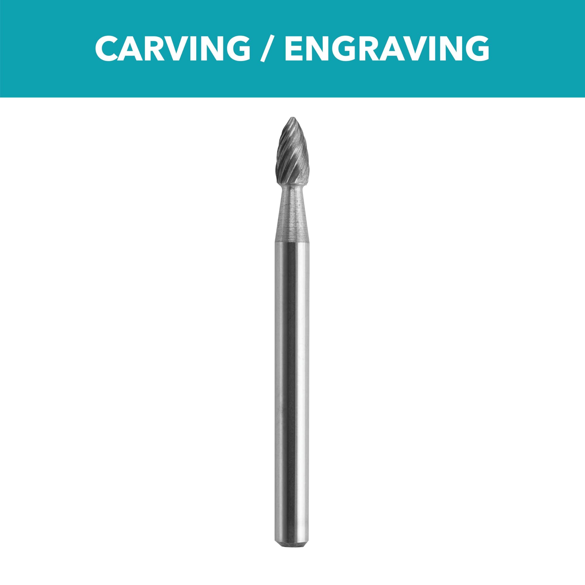 Durable tungsten carbide material. Ideal for shaping and smoothing hard materials. Fits 1/8-inch rotary tools.