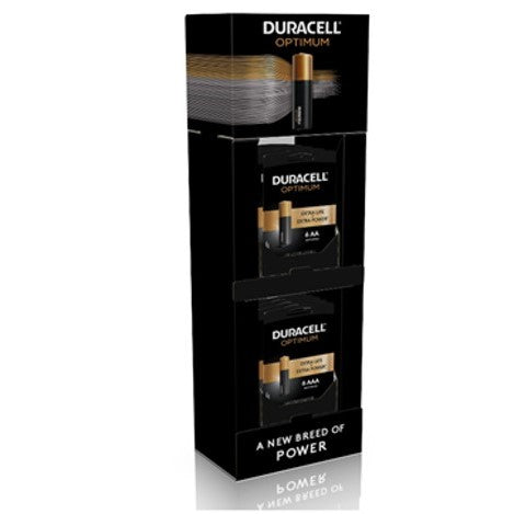 The Duracell Optimum Mini Wing Stand is a space-efficient retail display designed to prominently feature Duracell AA battery 6-packs. Its durable construction and modest dimensions make it suitable for placement on countertops or sales floors.