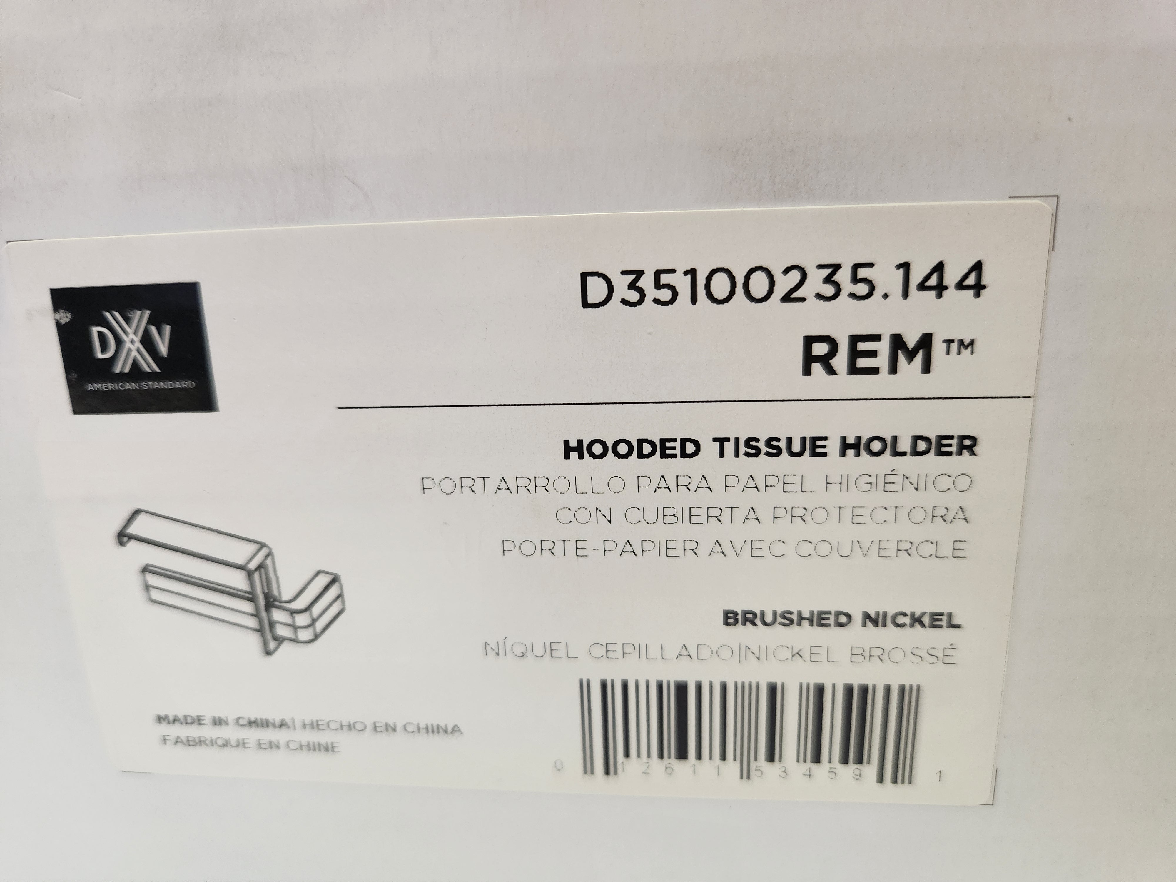 DXV D35100235.144 is a REM Hooded Tissue Holder designed for bathroom and hygiene use. The brushed nickel finish provides a clean look while being durable. This tissue holder is easy to install and keeps tissue rolls hidden.