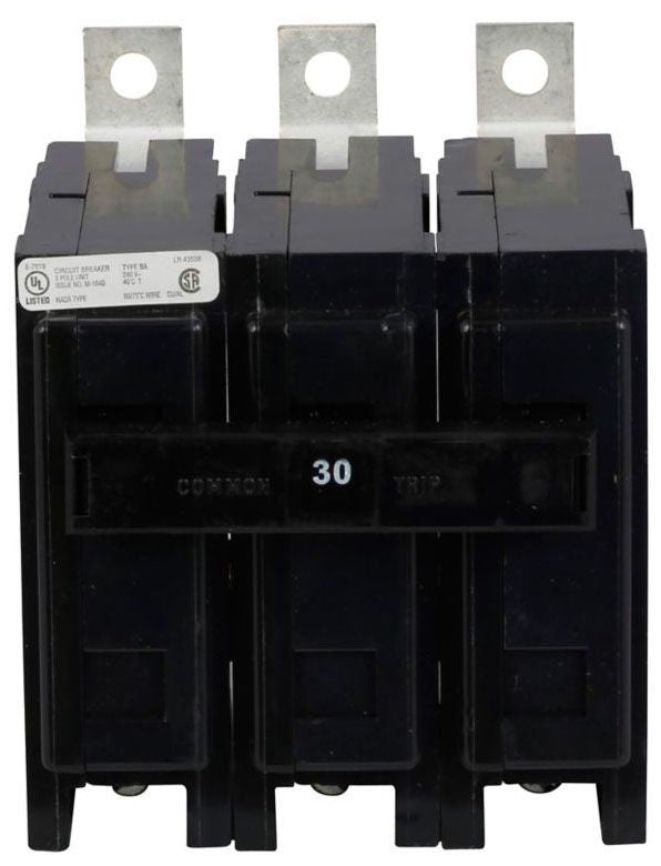The Eaton BAB3035H is a Quicklag industrial thermal magnetic circuit breaker. This breaker is rated at thirty-five amps and operates at two hundred forty volts with a ten kAIC interrupt rating. It consists of three poles and features a non-interchangeable thermal magnetic trip design.