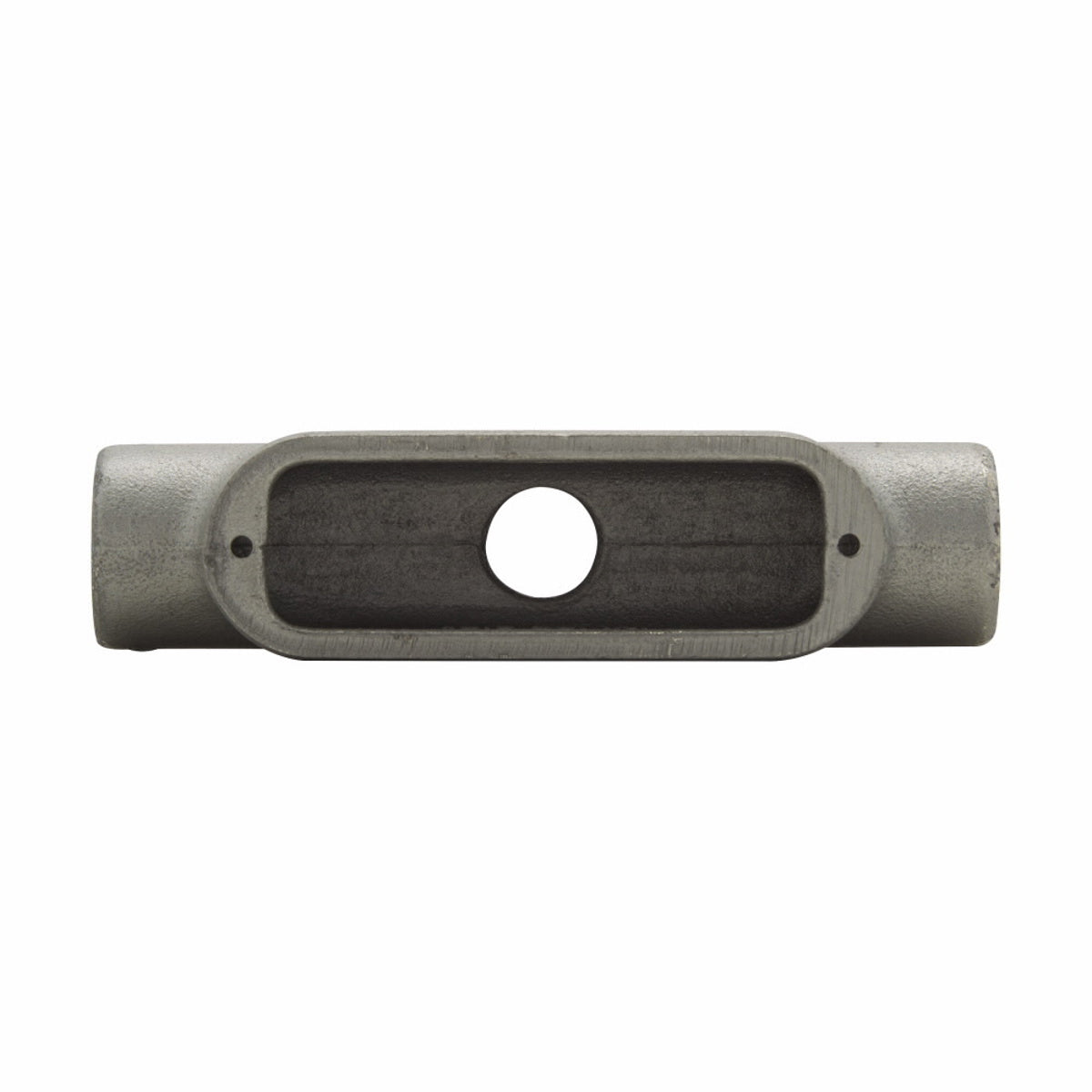 The Eaton TB38 Condulet Outlet Body is a conduit fitting designed for electrical applications. It is made from durable Feraloy iron alloy and is painted with aluminum acrylic to provide corrosion resistance. The TB38 features a one-inch hub size and is designed for use with rigid threaded conduit. It provides a spacious interior for heavier conductors and has been engineered for optimal installation efficiency.