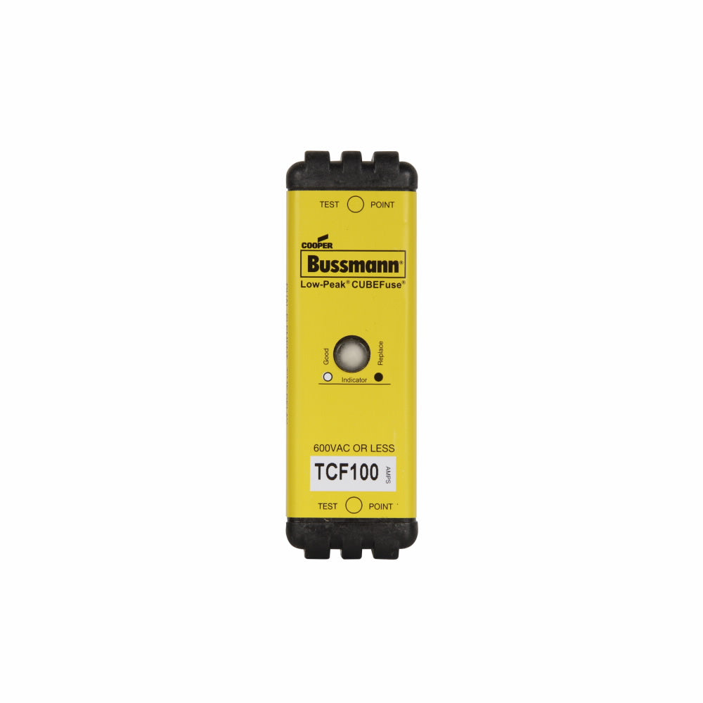 Eaton TCF100 BUS 100A CUBE FUSE is a Bussmann CUBEFuse designed for electrical applications. This fuse is rated for 100 amperes and can handle voltages up to six hundred volts alternating current or three hundred volts direct current. The TCF100 features a square body design, making it suitable for various mounting types including chassis and DIN rail.