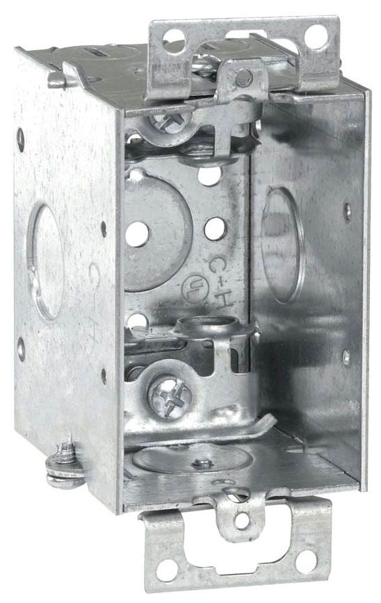 The Eaton Crouse-Hinds series Switch Box, catalog number TP178, is a durable steel box designed for housing electrical devices, switches, and outlets. This gangable model features a cubic capacity of twelve point five cubic inches, making it suitable for various applications in commercial and institutional buildings. The switch box has provisions for armored and metal clad cable with AC/MC clamps and features ears for easy mounting.