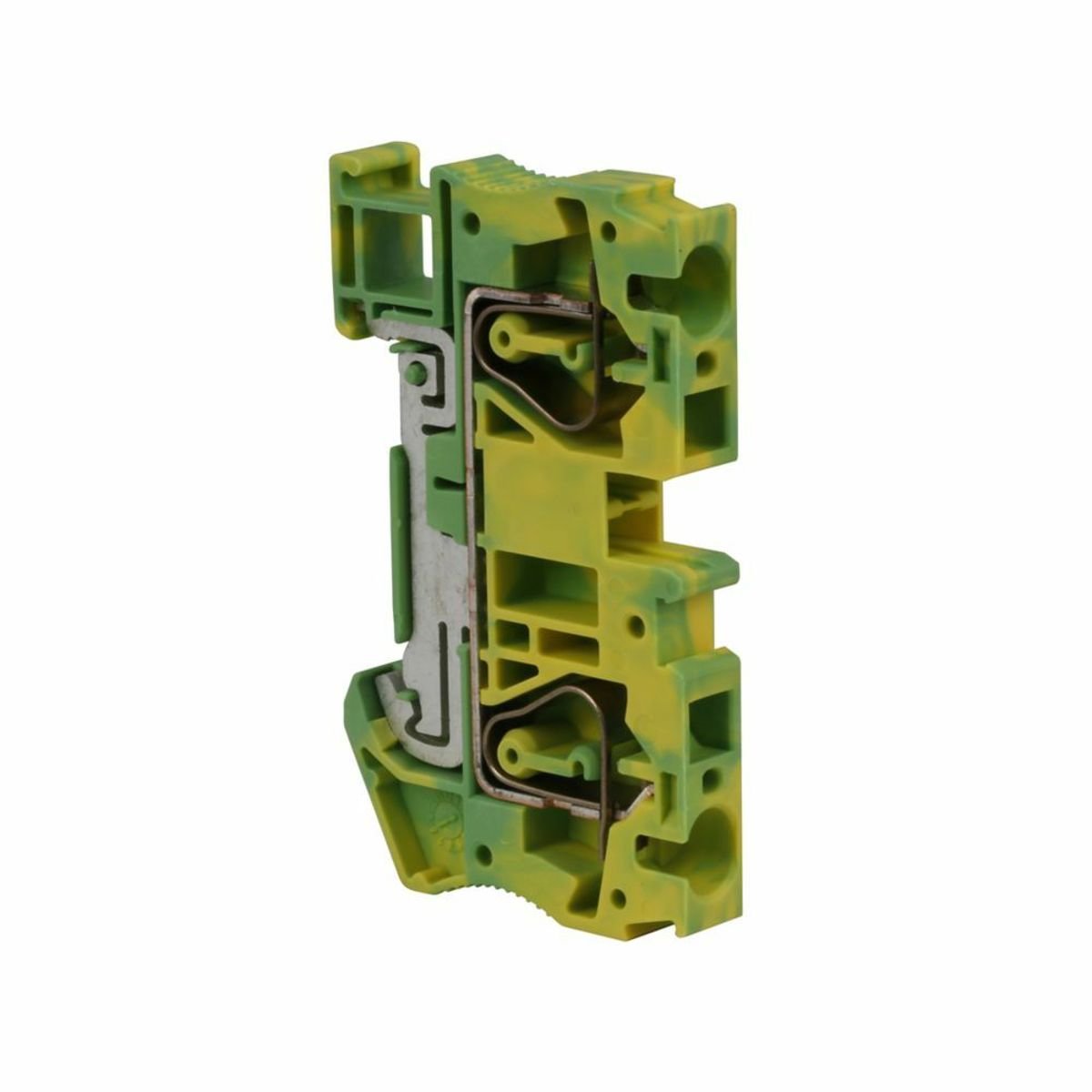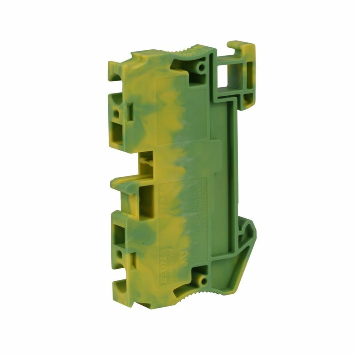 Eaton XBPT6PE is an IEC terminal block designed for 20 to 8 AWG wire sizes. It features a spring cage connection for simple installation and secure wire holding. The terminal block's design facilitates easy wiring in electrical assemblies.