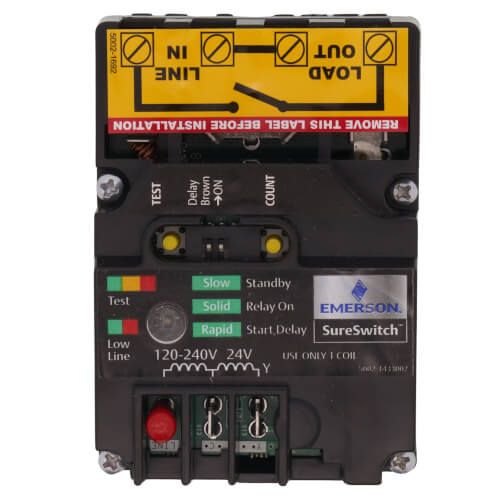 The Emerson SureSwitch Multi-Volt Universal Electronic Contactor, MPN 49M11-843, is designed for replacing single and two-pole contactors in HVAC applications such as air conditioners and heat pumps. It offers robust performance and function, ensuring efficient operation.