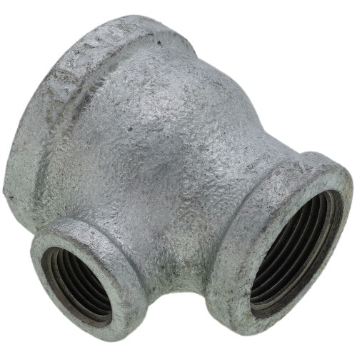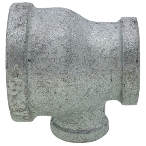 The Everflow GMRT1214 is a galvanized reducing tee designed for plumbing applications. This fitting allows for the connection of three pipes at different diameters: one and a half inches, one inch, and half an inch. It is ideal for reducing pipe size in a plumbing system.