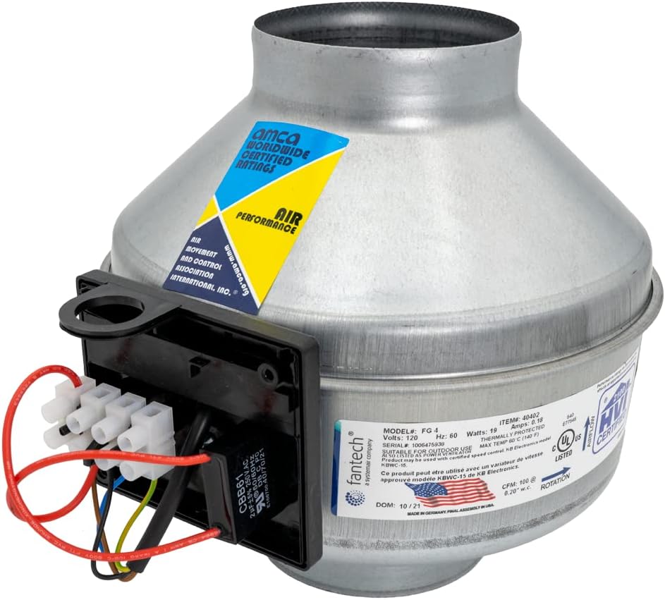 The Fantech FG4 is a centrifugal inline duct fan that delivers a maximum airflow of 135 CFM. Constructed with galvanized steel, it ensures durability and peak performance in ventilation applications. This fan fits a four-inch duct and operates at 120 volts, making it suitable for various setups.