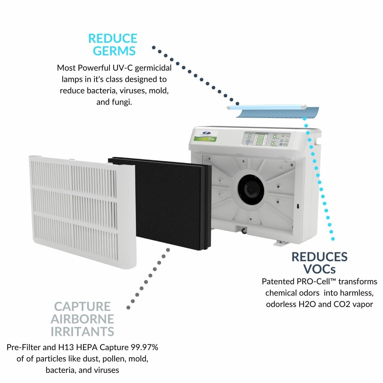 The Field Controls 46650000 Trio Portable Air Purifier features a robust three-stage air treatment system. This system is designed specifically for allergy relief in various settings. It effectively combines True HEPA filtration, UVC technology, and PRO-Cell technology in one compact device, ensuring high-quality air purification.