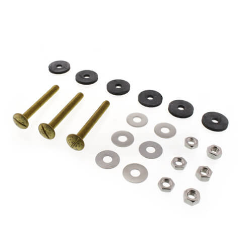 The Fluidmaster 6105 is a tank to bowl kit designed to connect the toilet tank to the toilet bowl with three solid brass bolts. This product is essential for ensuring a secure and leak-free fit. The included sponge rubber gasket fits most close-coupled toilets, accommodating both round and hex-shaped flush valve nuts. This kit is a reliable solution for installation or repair of rocking toilets.