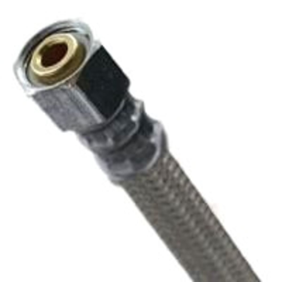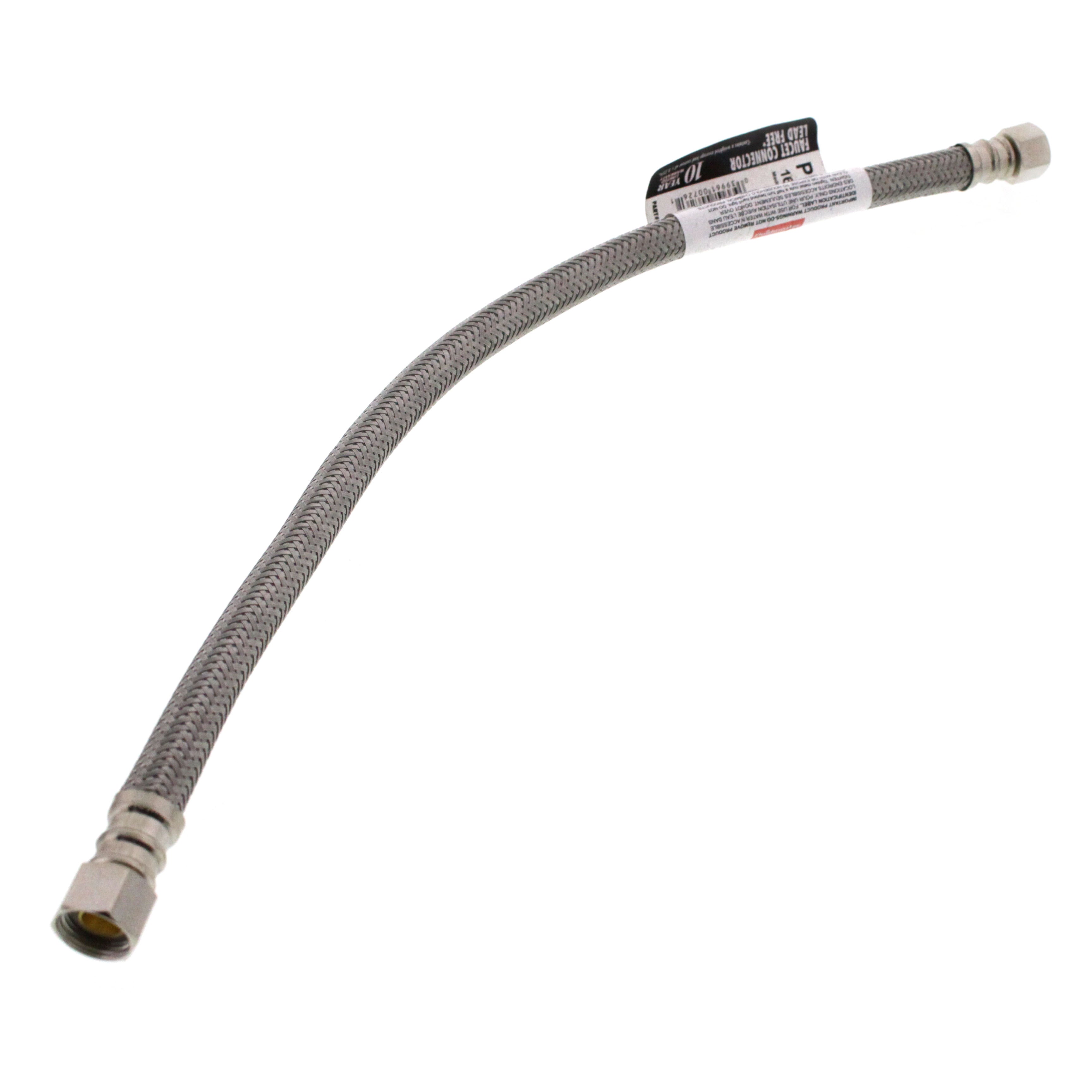The Fluidmaster PRO6F16 is a faucet connector designed for efficient water supply applications. Made with a female compression end style, it measures three eighths inch by three eighths inch and is sixteen inches long. This connector operates at a working pressure of 125 psi. It features braided stainless steel construction that enhances durability and flexibility.