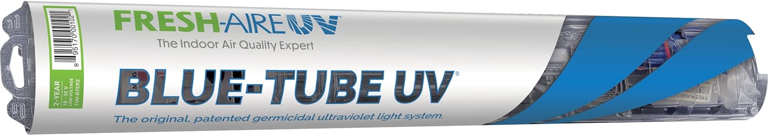 The Fresh-Aire UV TUV-BTER is a germicidal UV light system designed for HVAC applications. The Blue-Tube UV system utilizes a powerful UV-C light to continuously kill germs in the air and on surfaces within the air system, enhancing indoor air quality by sterilizing airborne microbes including viruses, bacteria, and mold.