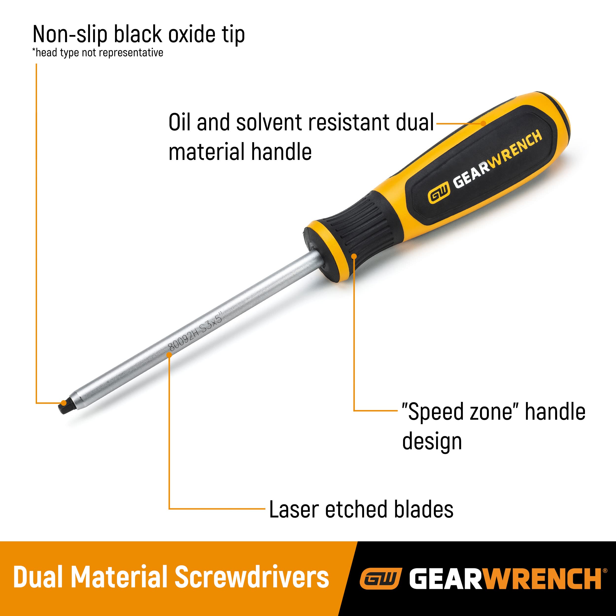 The Gearwrench 80009H is a dual material screwdriver designed for performance and comfort. This screwdriver features an ergonomic tri-lobe handle which helps to minimize effort during use. The design includes a non-slip black oxide tip to enhance grip on fasteners, reducing slippage. Ideal for both professional and home use, it is suitable for a variety of low-torque applications.