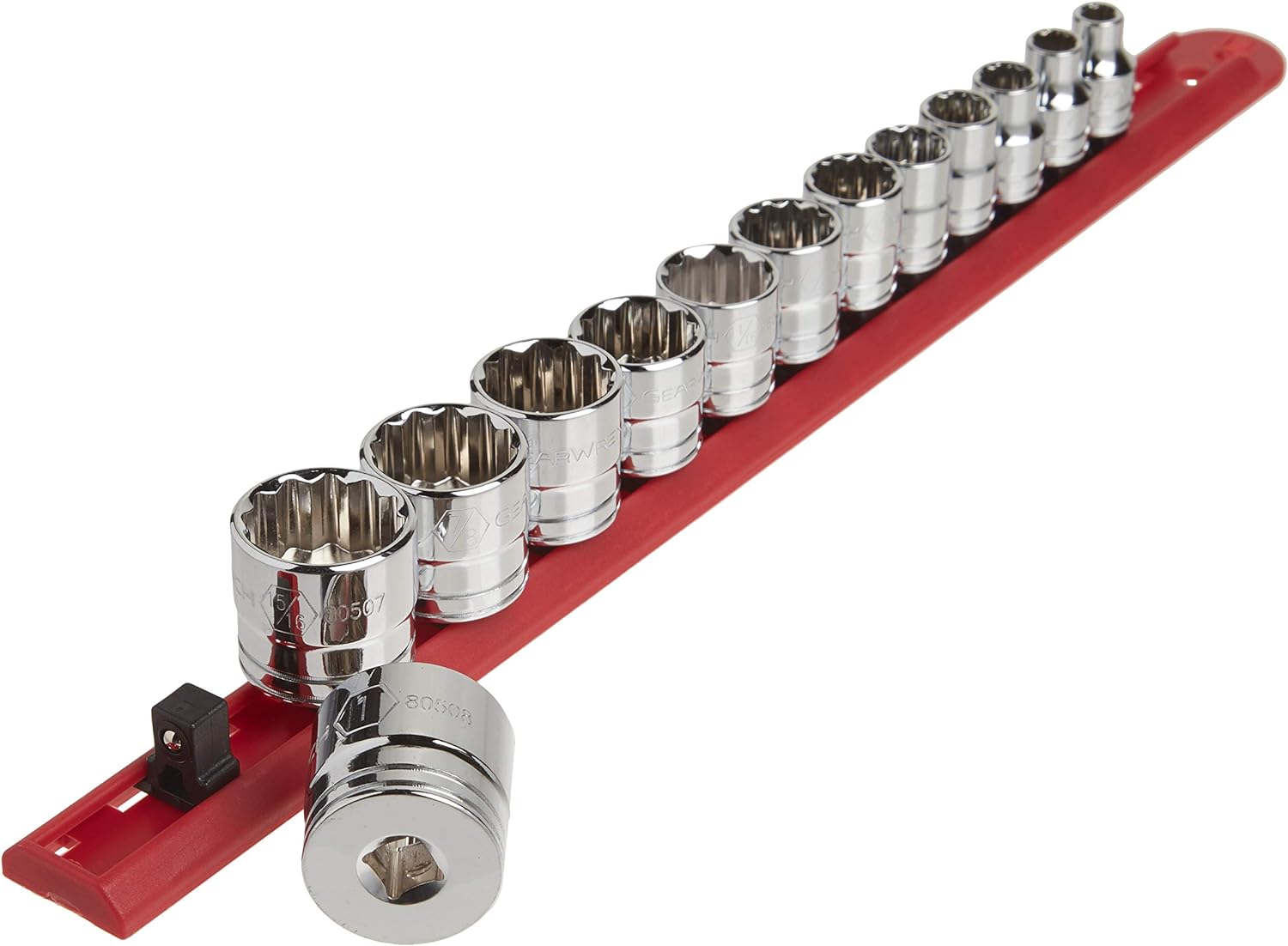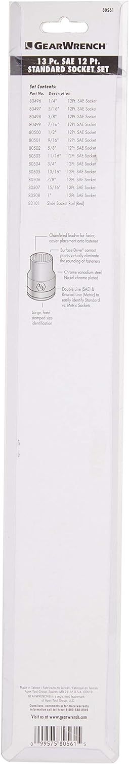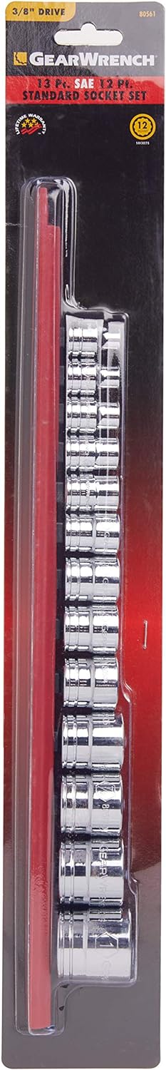 The GEARWRENCH 13 Pc. 3/8 Drive 12 Pt. Standard Socket Set, MPN 80561, is designed for versatility and convenience in various applications.