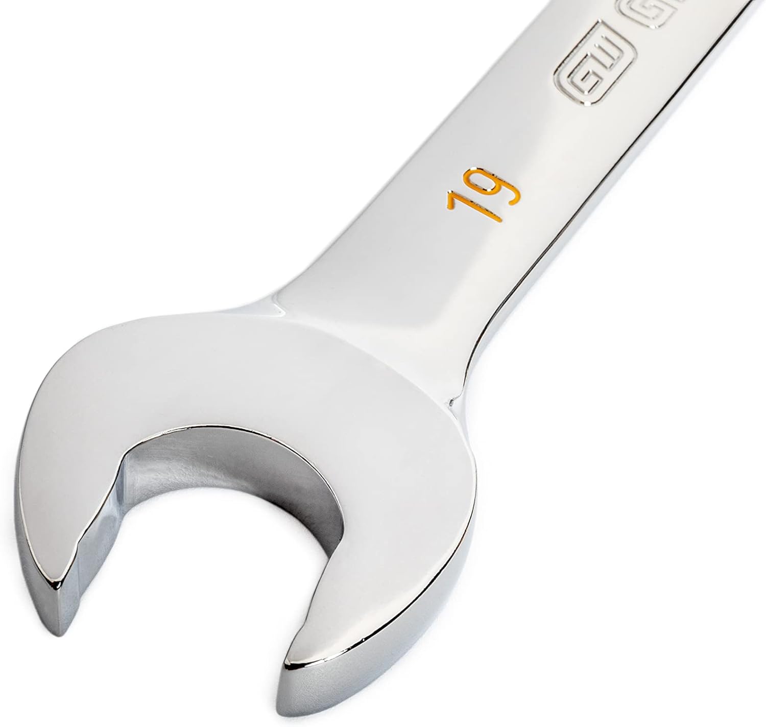 This 19mm combination wrench from Gearwrench features a 90-tooth ratcheting box end that allows a 4-degree swing arc, ensuring fasteners are turned easily even in tight spaces. The off-corner loading design enhances grip and minimizes the risk of rounding fasteners. The longer, wider beam provides improved reach, leverage, and comfort.