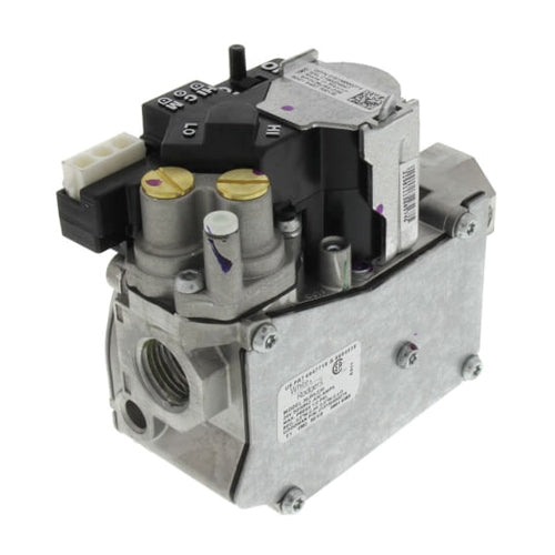The Goodman Gas Valve with part number 0151M00027S is designed for use in HVAC systems requiring reliable gas control. This model features a half inch inlet and outlet with a voltage rating of twenty-four volts. It is suitable for Goodman and Amana furnaces. This gas valve operates efficiently in two stages to regulate gas flow.