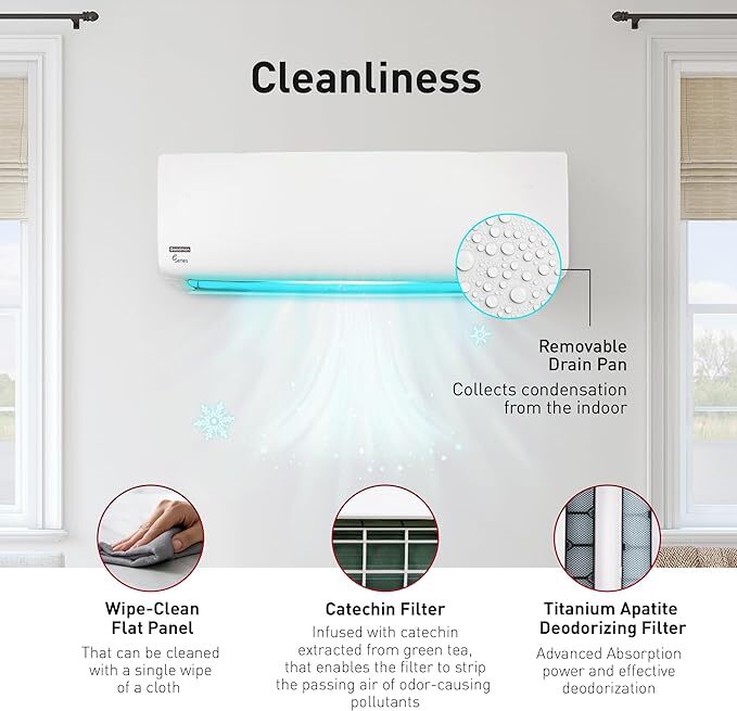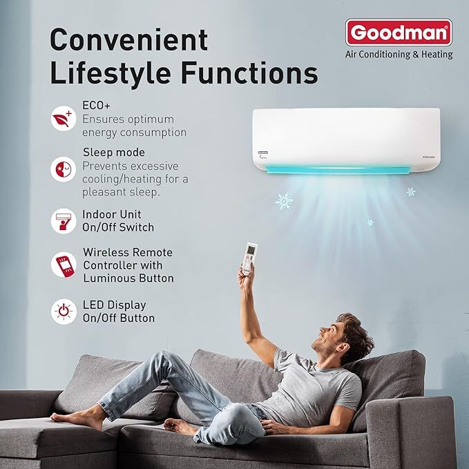 The Goodman e-Series RXNG12AXVJU FTXNG12AXVJU system serves all your single zone heating and cooling needs. This setup includes a wall-mounted indoor unit and an outdoor heat pump, designed to provide both warm and cool air quietly and efficiently. These units are energy-efficient, ensuring cost-effective home comfort.