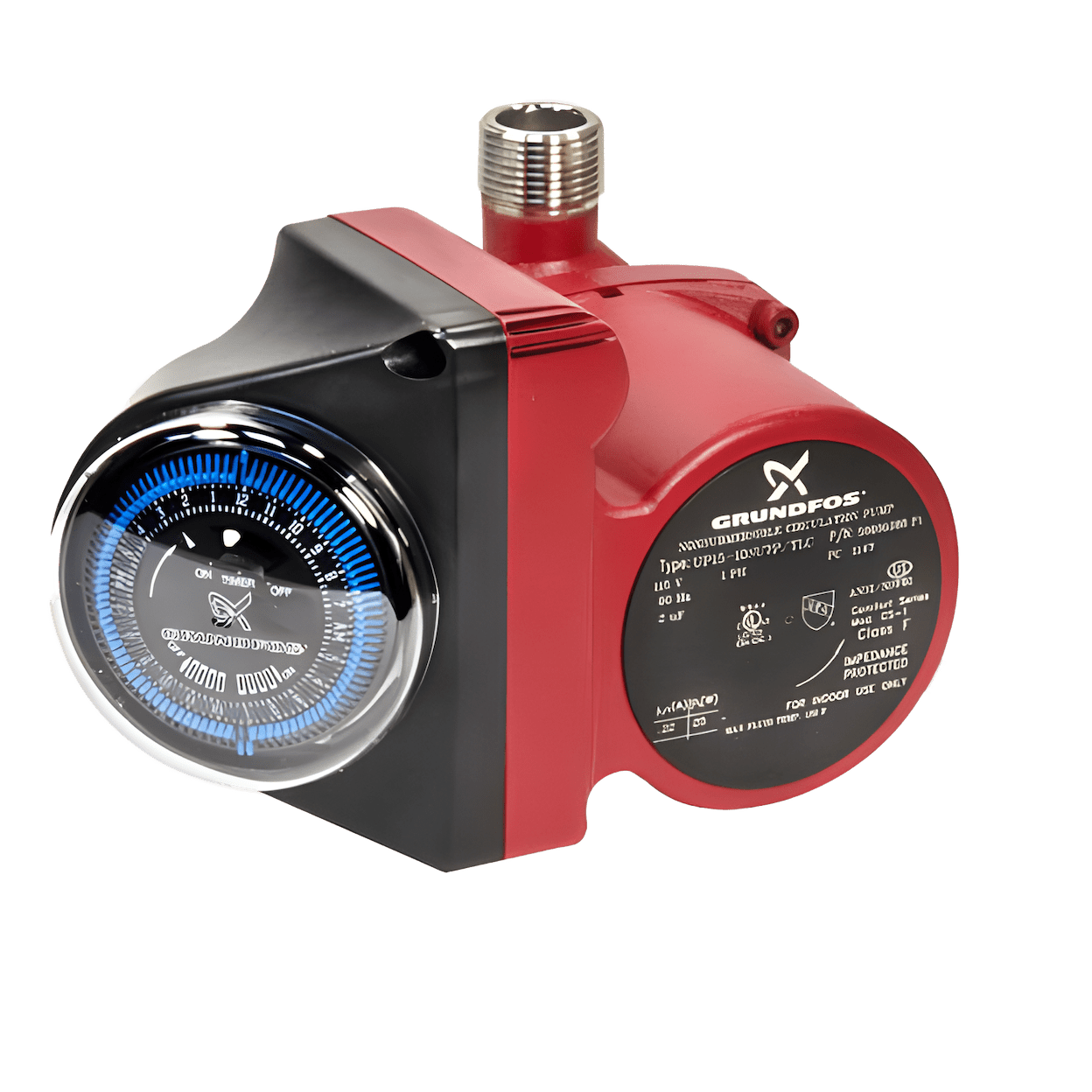 The Grundfos 595916 is a 1/25 HP, 115V stainless steel circulator pump designed for efficient hot water recirculation in homes. It features a built-in timer for convenience and energy savings. The pump delivers a flow rate of 6.16 gallons per minute and has a maximum head of 5-1/4 feet.