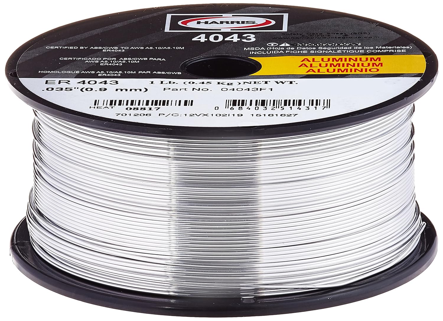 The HARRIS 04043F1 is a 4043 aluminum MIG welding wire designed for high-quality welding. This product has a diameter of 0.035 inches and comes in a one-pound spool, suitable for various applications. The wire is a 5% silicon alloy that excels in welding heat treatable base alloys, particularly in the 6000 series. The unique formulation enhances fluidity and bead appearance while reducing crack sensitivity.